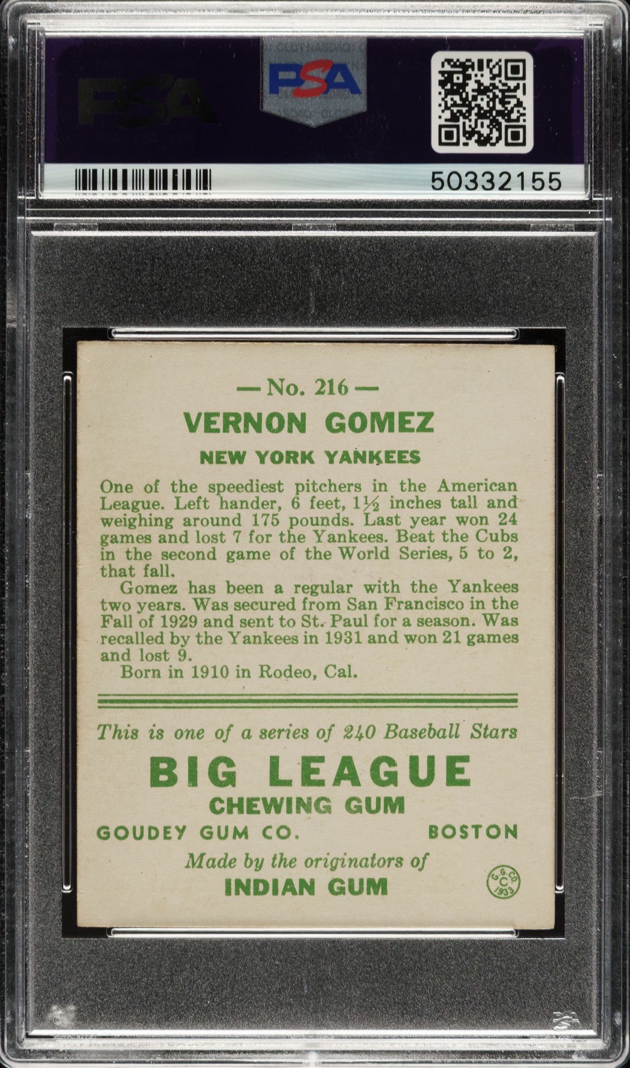 Graded EX-MT 6 by PSA. New York Yankees Hall of Famer Lefty Gomez.