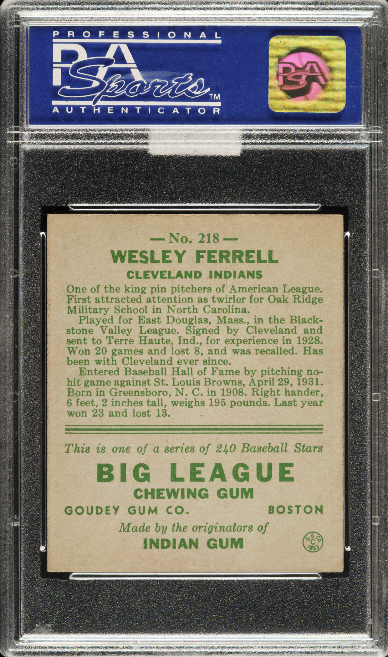 Graded EX-MT 6 by PSA. Cleveland Indians. Awarded an MBA Gold Diamond by Mike Baker Authenticated for high-end eye appeal. A corresponding MBA sticker is affixed to the front of the holder.