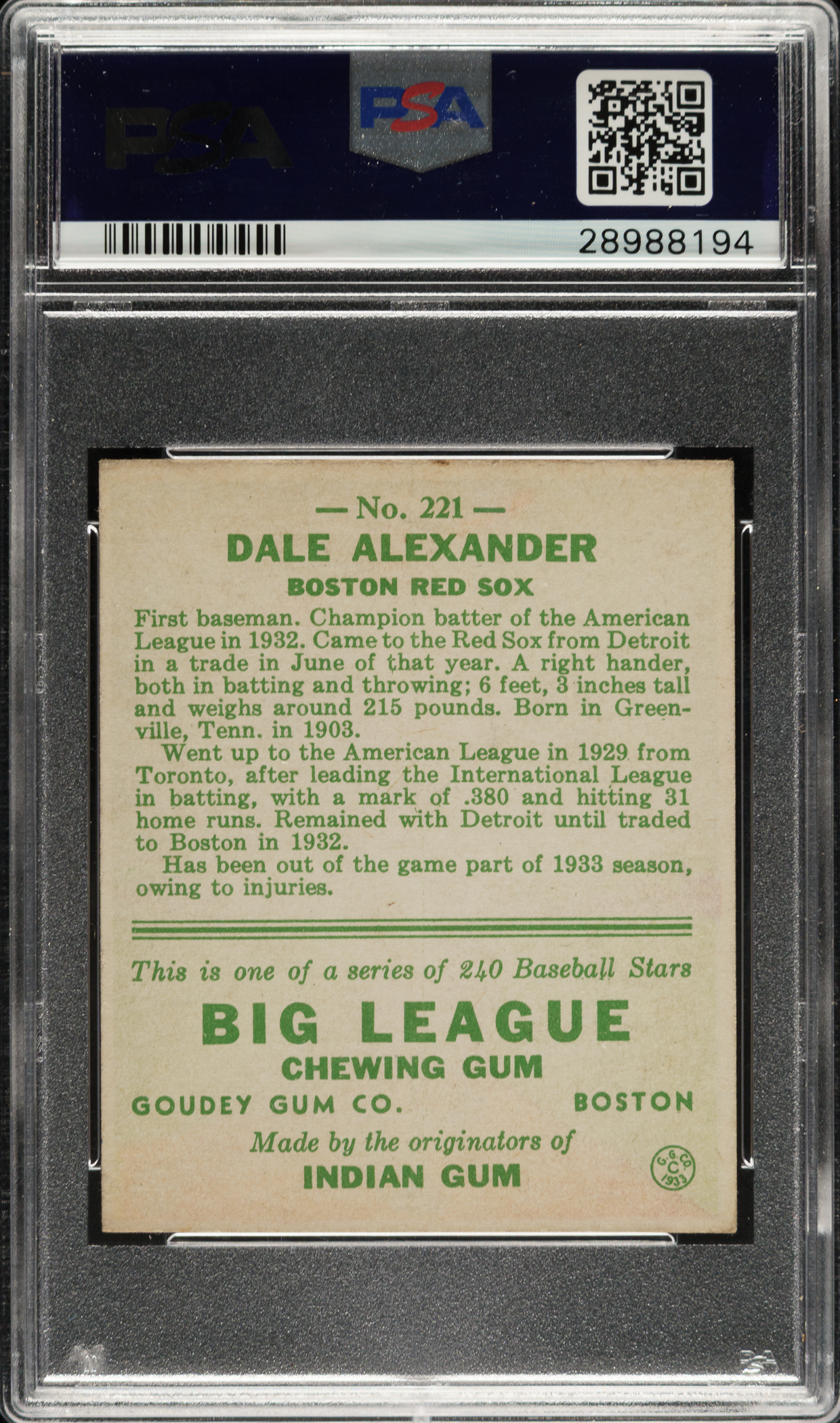 Graded EX-MT 6 by PSA. Boston Red Sox.