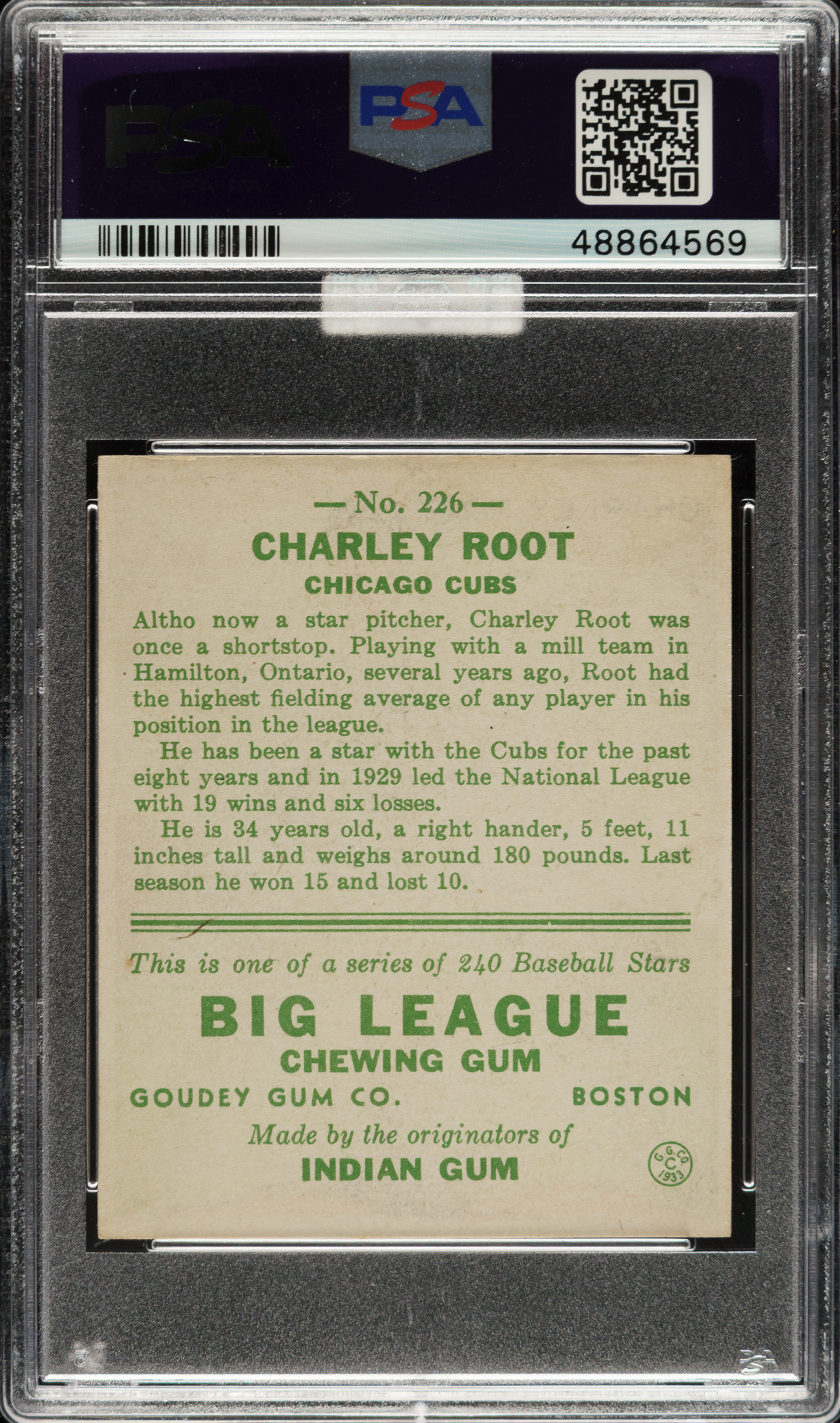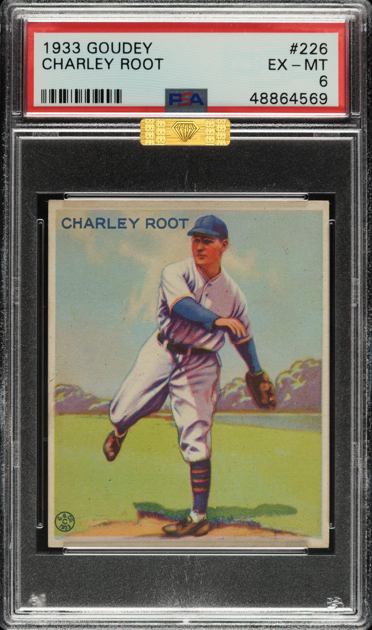 Graded EX-MT 6 by PSA. Chicago Cubs. Awarded an MBA Gold Diamond by Mike Baker Authenticated for high-end eye appeal. A corresponding MBA sticker is affixed to the front of the holder.