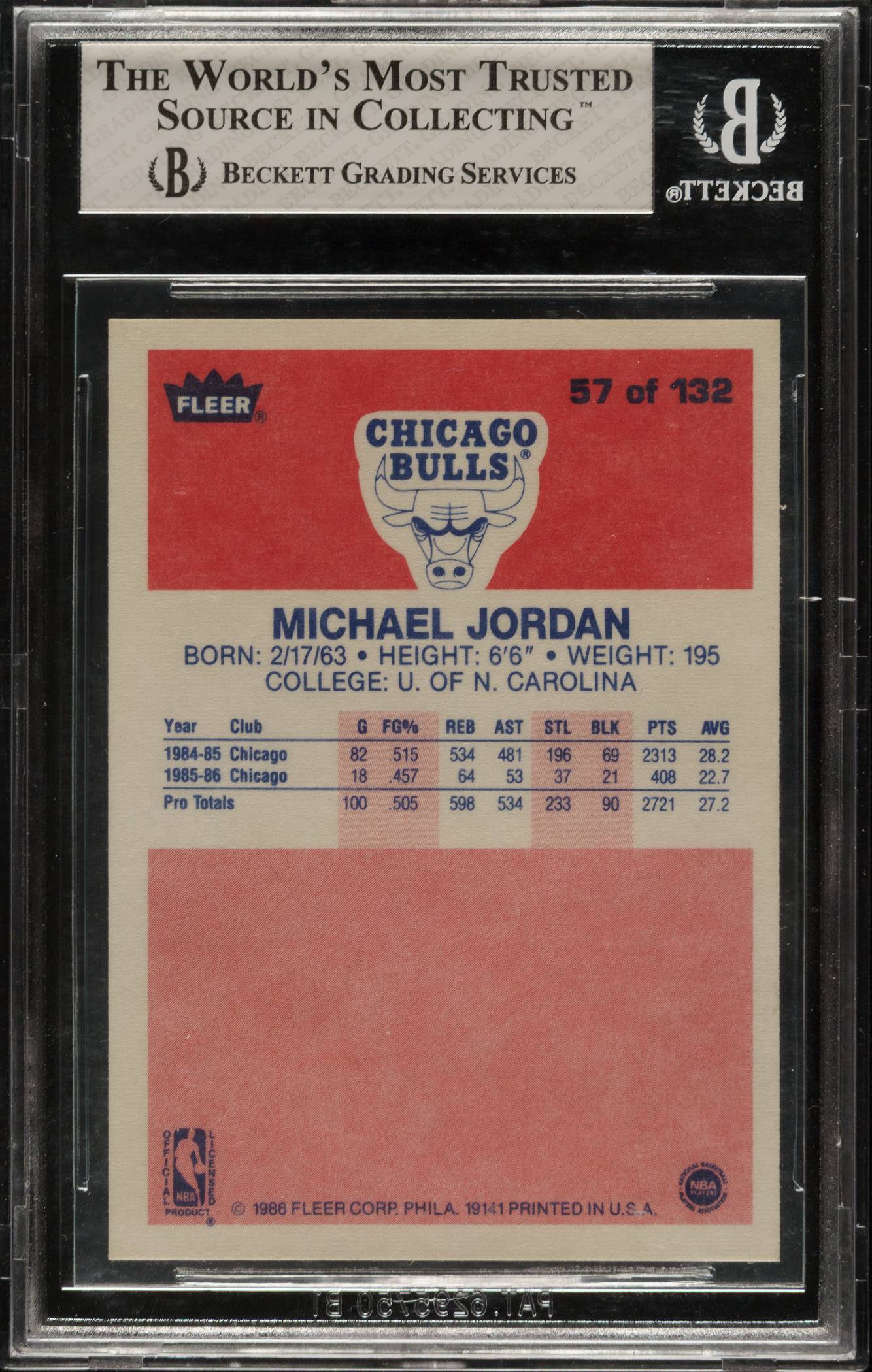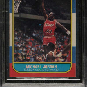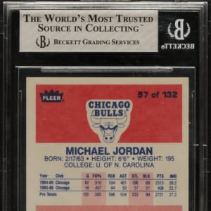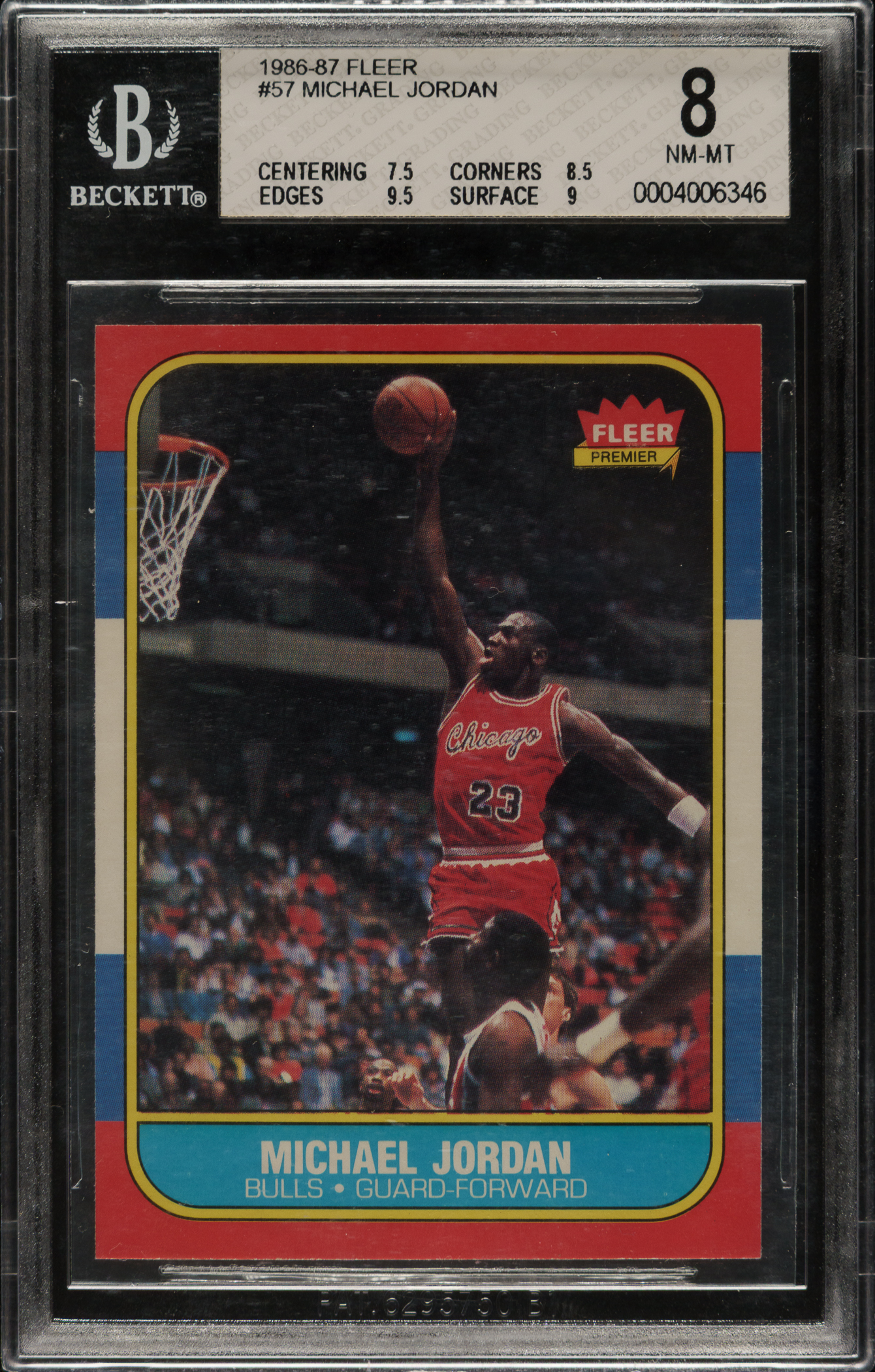 Beautiful high-grade rookie card of Michael Jordan, arguably the greatest basketball player ever. This is an outstanding example of the premier modern-day basketball card. The 1986-1987 Fleer basketball issue is extremely condition-sensitive due to its blue and red flush-to-the-border design. Graded NM-MT 8 by BGS, the subgrades are 9.5 for edges, 9 for surface, 8.5 for corners, and 7.5 for centering. The Fleer Jordan card is one of the cards that is recognizable to collectors of all ages and is one of the great cardboard collectibles in our hobby. A tremendous example of this most sought-after modern basketball card classic in NM-MT condition.