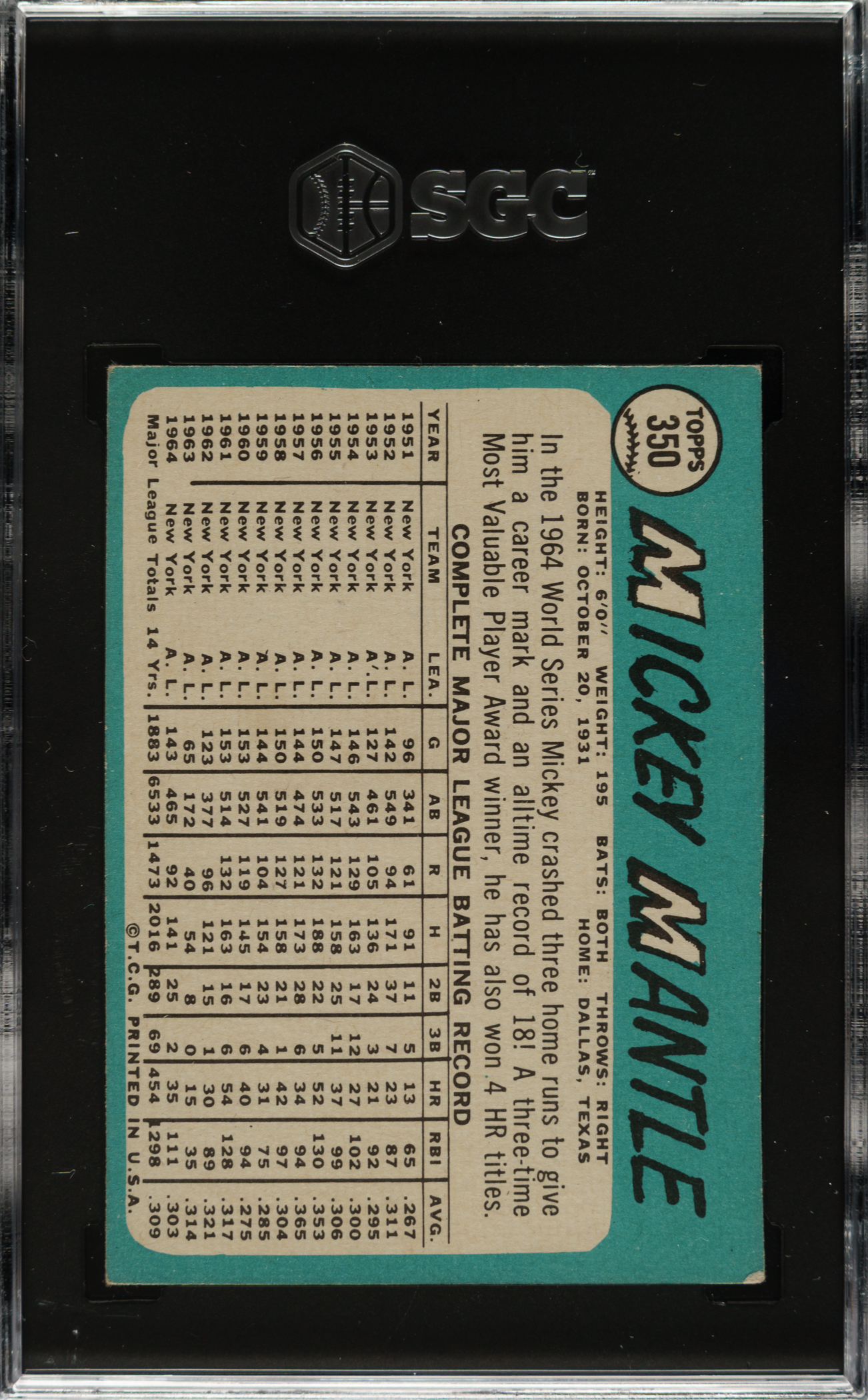 Lot # 3038: 1965 Topps #350 Mickey Mantle SGC EX 5