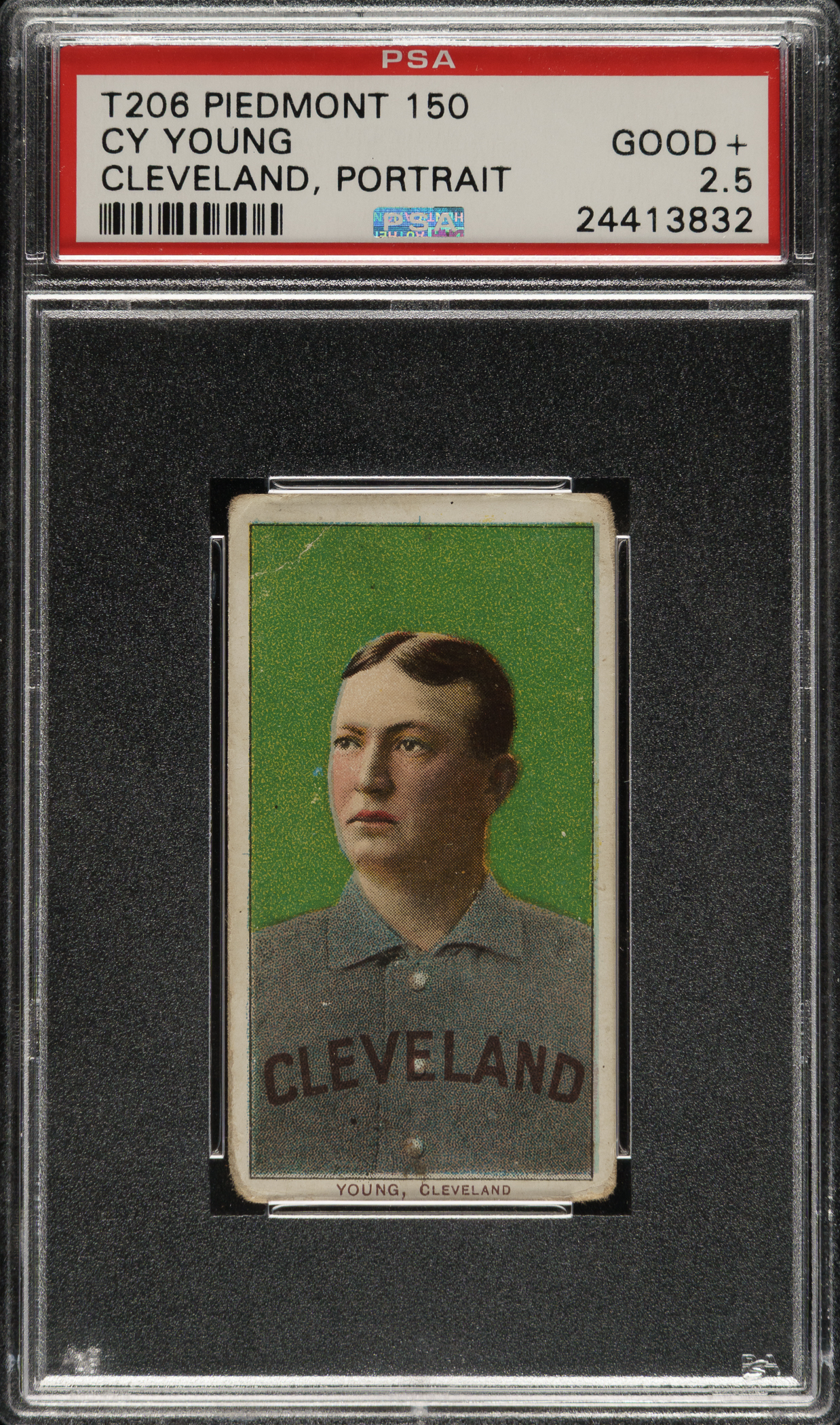 Graded GOOD+ 2.5 by PSA. Attractive T206 example of Cy Young (portrait) set against a beautiful green background. This is one of Cy Young's most striking cards and one of the most popular cards in the entire T206 set. This example has vibrant colors and a crisp image of Young. Boldly printed Piedmont 150 advertising reverse. Downgraded largely due to corner wear (weaker bottom two) and an unobtrusive crease in the top left.