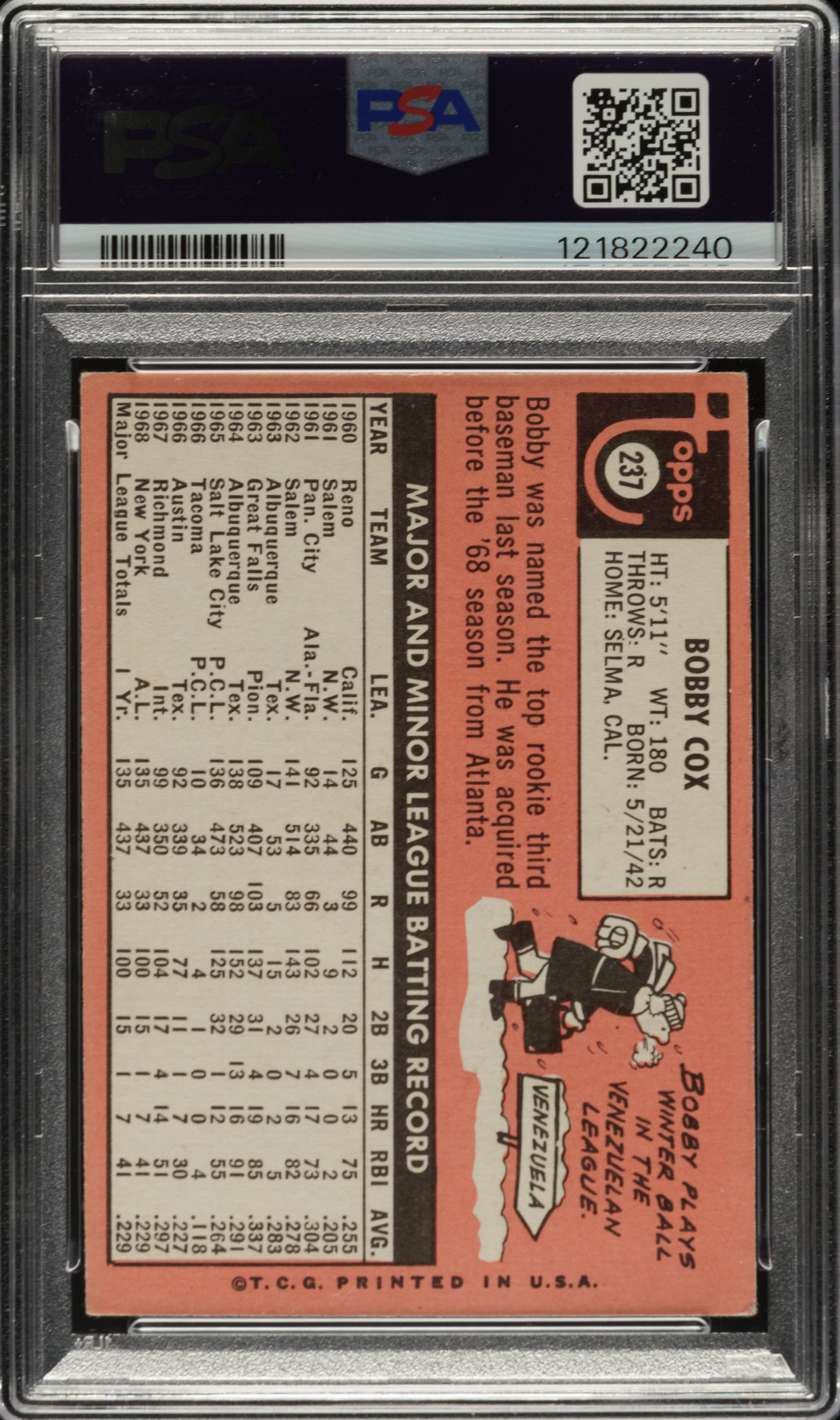 PSA/DNA has graded the signature MINT 9 and certified the card as Authentic. New York Yankees Hall of Famer Bobby Cox.