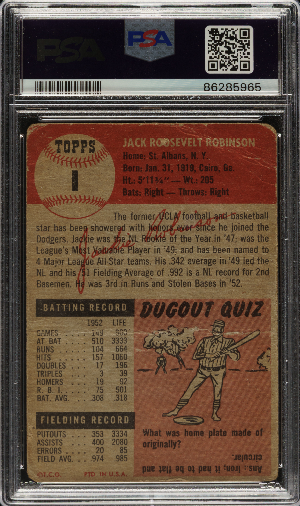 Graded POOR 1 by PSA. Brooklyn Dodgers Hall of Famer Jackie Robinson.