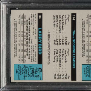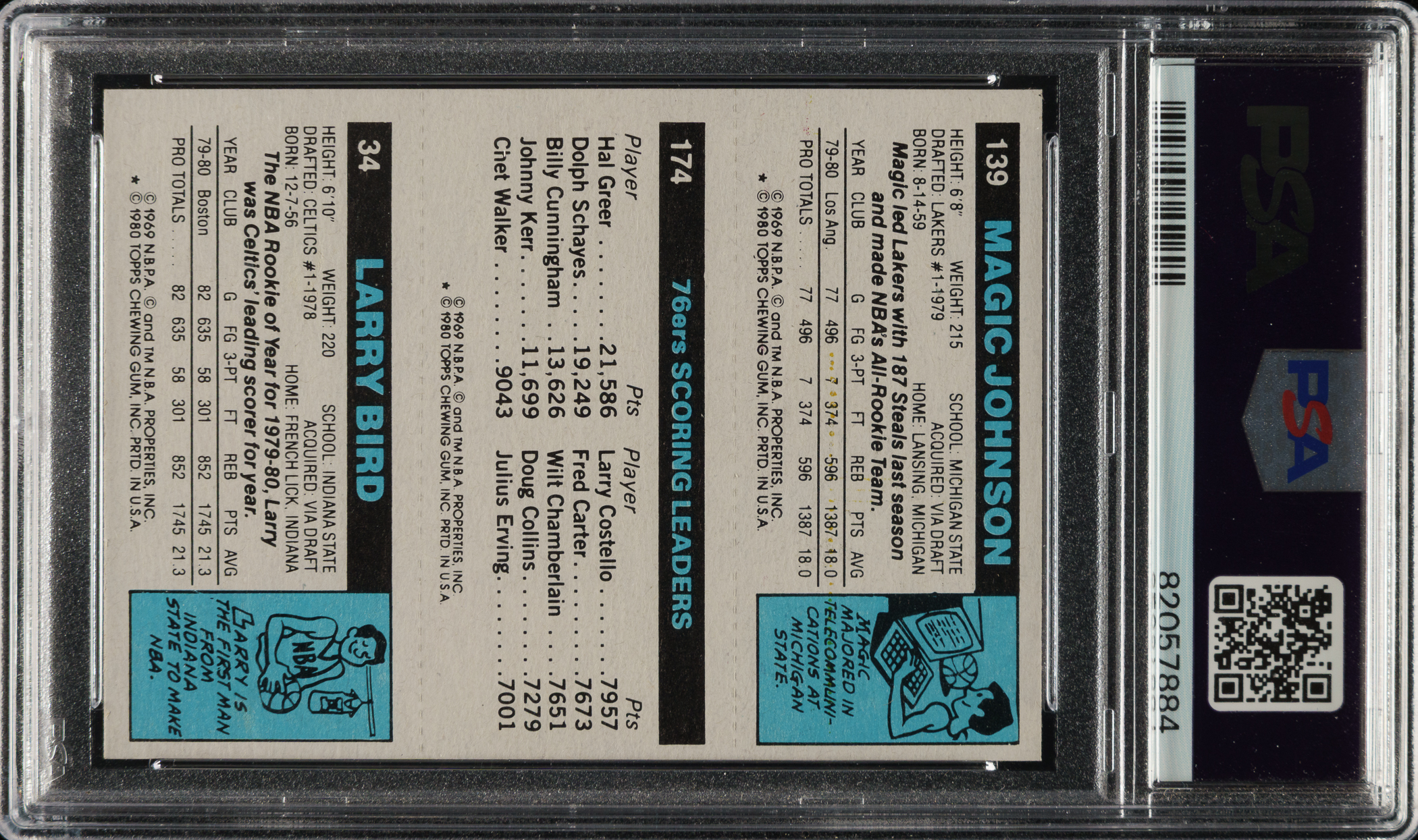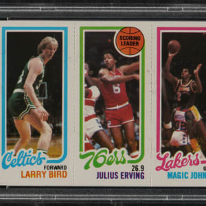 Graded EX-MT 6 by PSA. Hall of Famers Larry Bird (Boston Celtics), Julius Erving (Philadelphia 76ers), and Magic Johnson (Los Angeles Lakers).