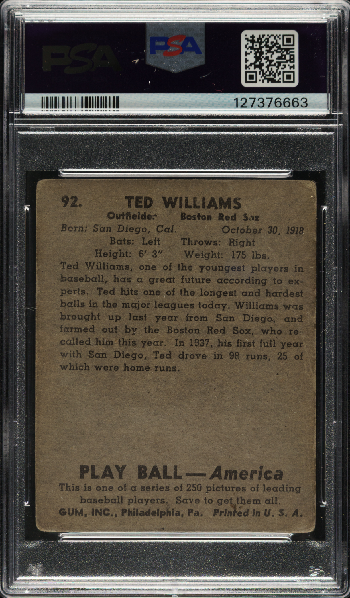 Graded FAIR 1.5 (MK) by PSA. Boston Red Sox Hall of Famer Ted Williams.