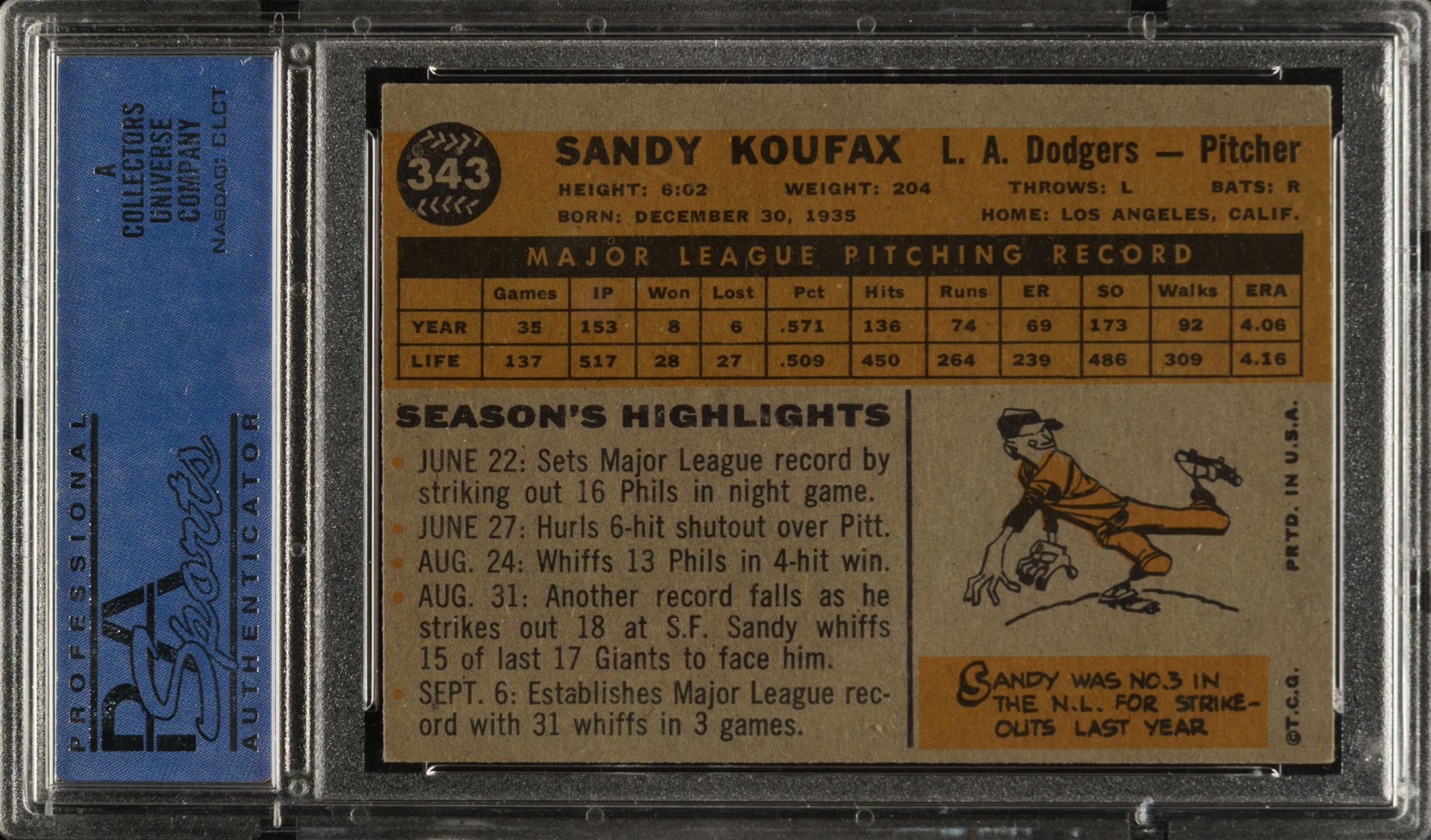 Graded EX-MT 6 by PSA. Los Angeles Dodgers Hall of Famer Sandy Koufax.