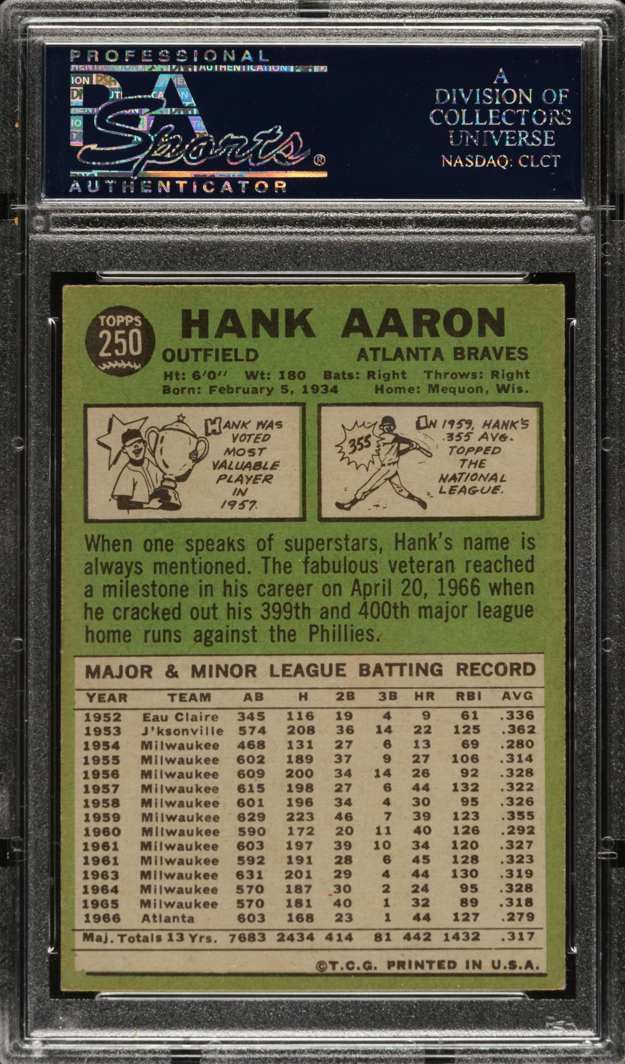 Graded EX-MT 6 by PSA. Atlanta Braves Hall of Famer Hank Aaron.