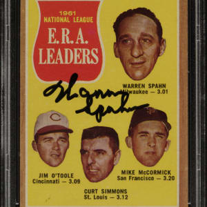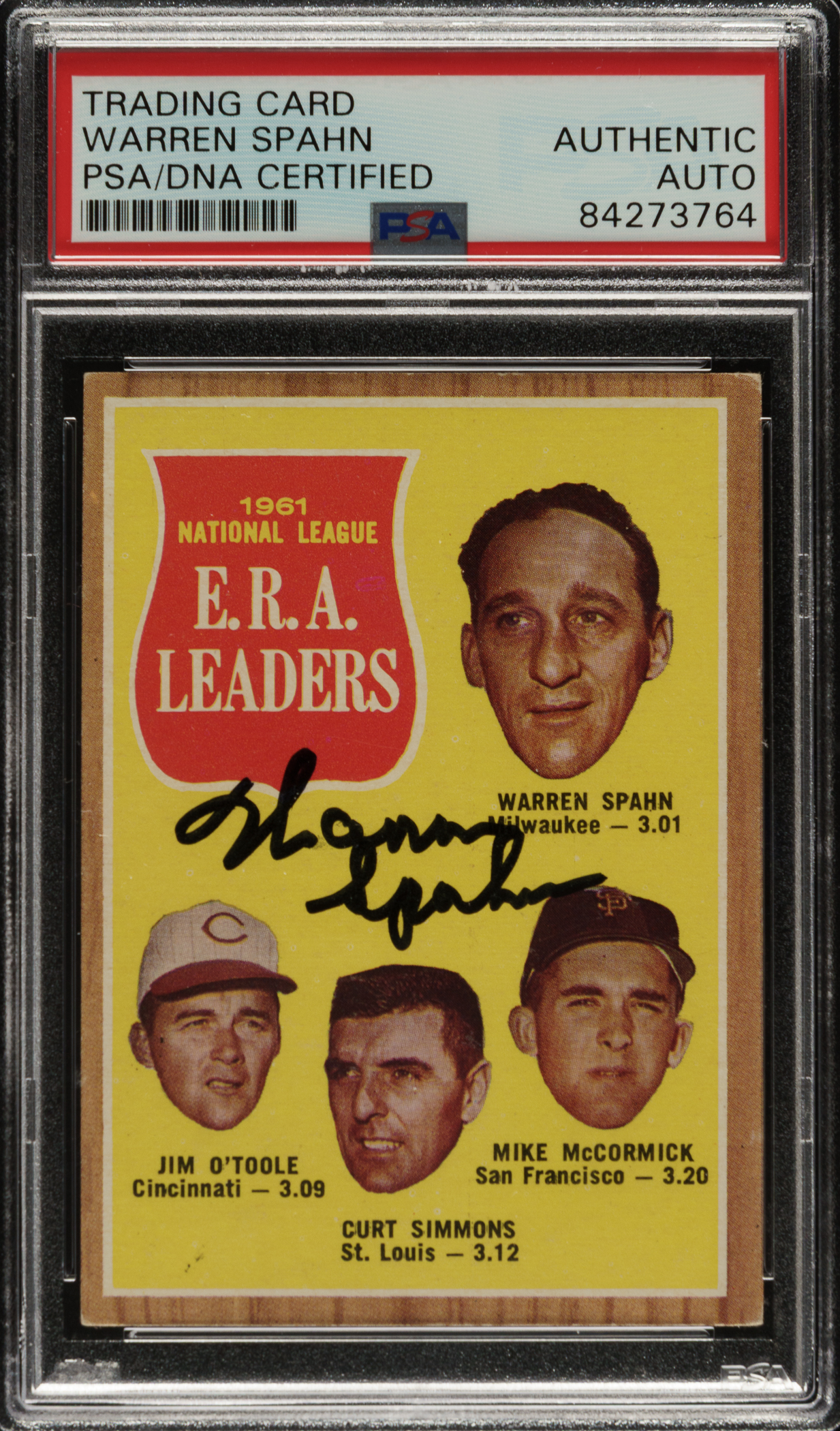 PSA/DNA has encapsulated the card, grading the signature Authentic. Milwaukee Braves Hall of Famer Warren Spahn.