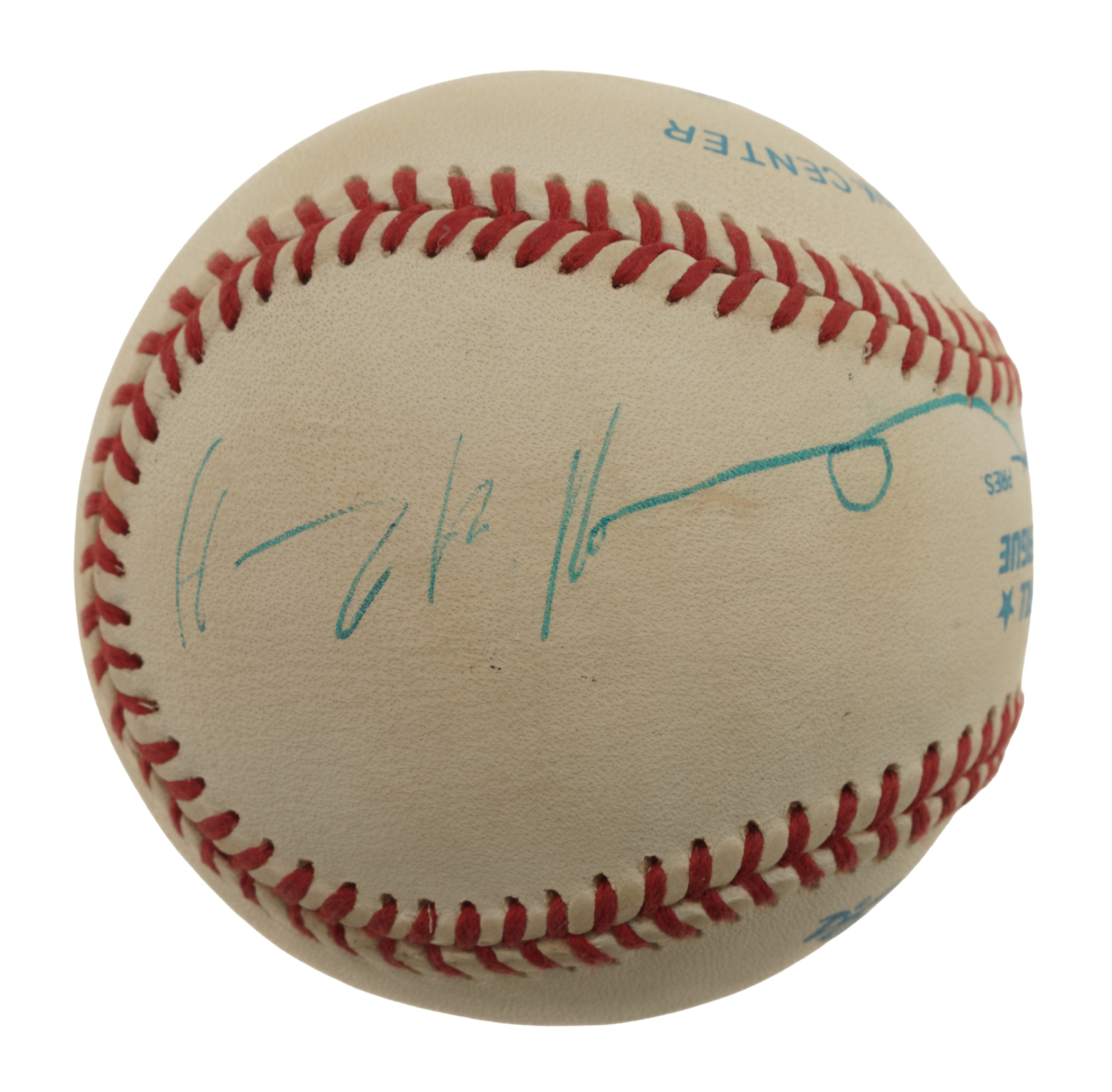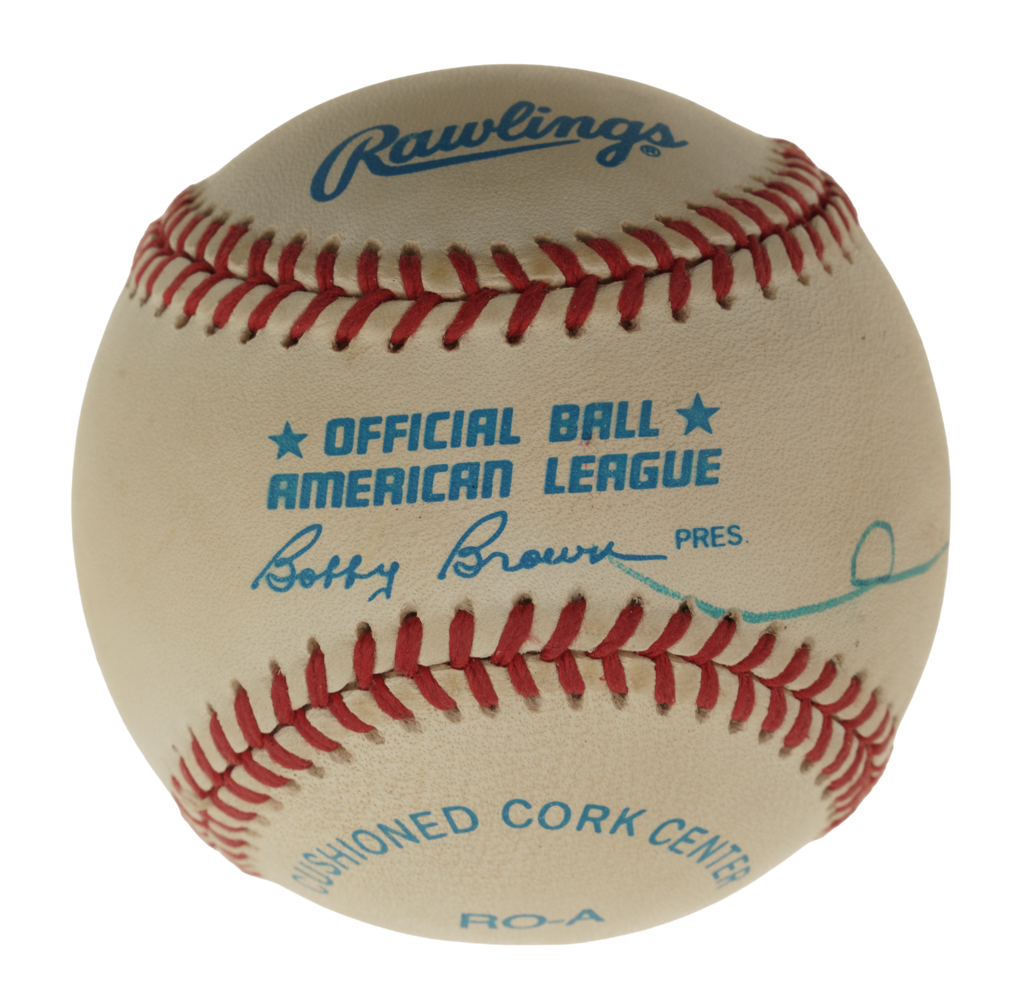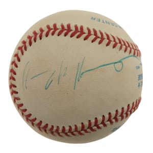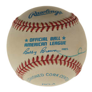 Official American League baseball (Brown) signed by Harry Kissinger, 56th Secretary of State of the United States. Kissinger has penned his name in blue ink along a side panel. The ball is very lightly toned throughout but is otherwise in Excellent to Near Mint condition overall. Auction LOA from James Spence/JSA.