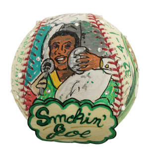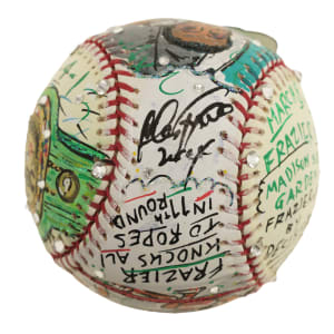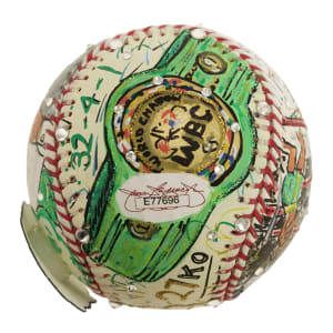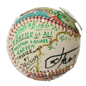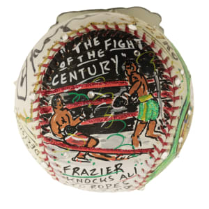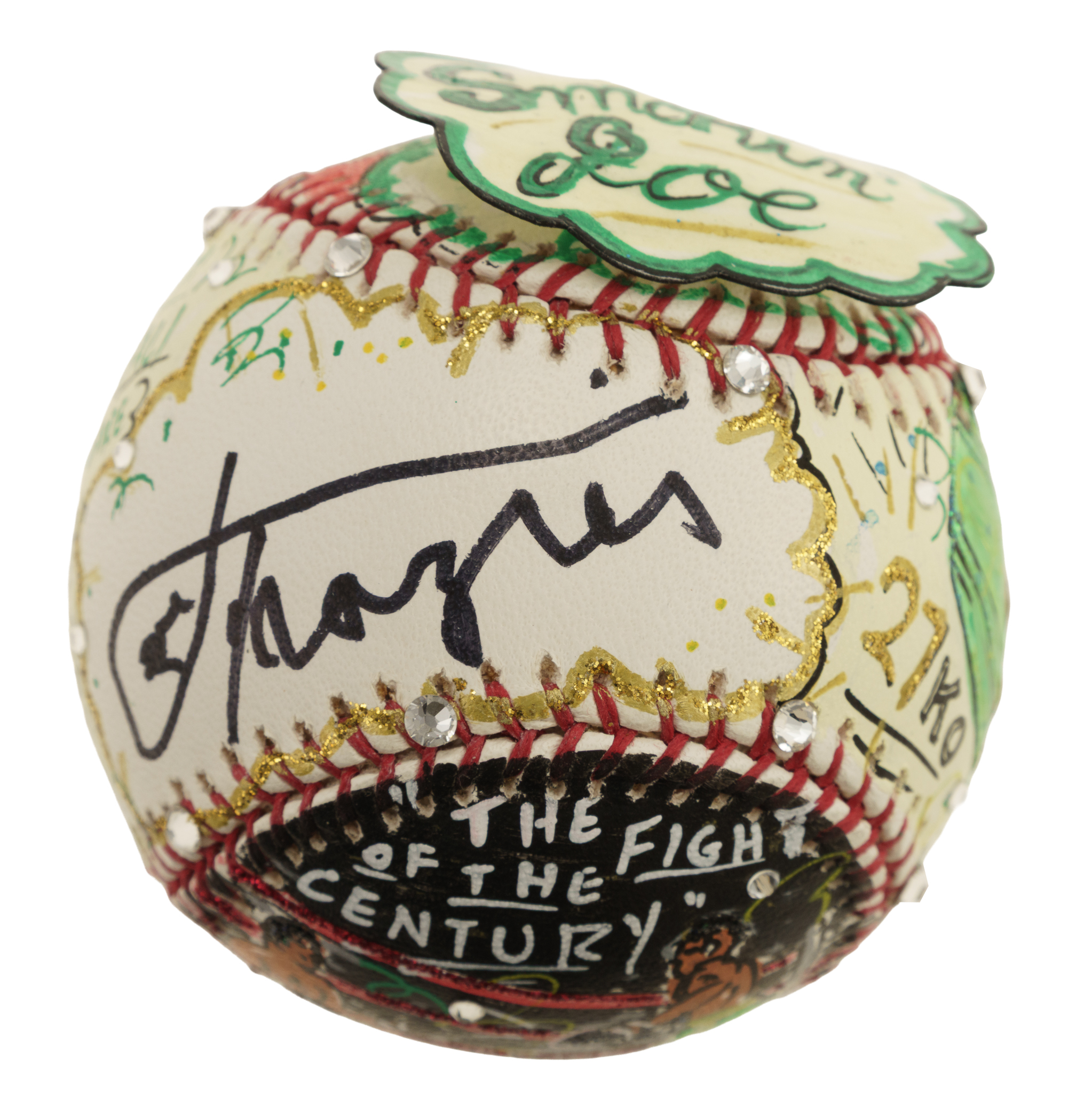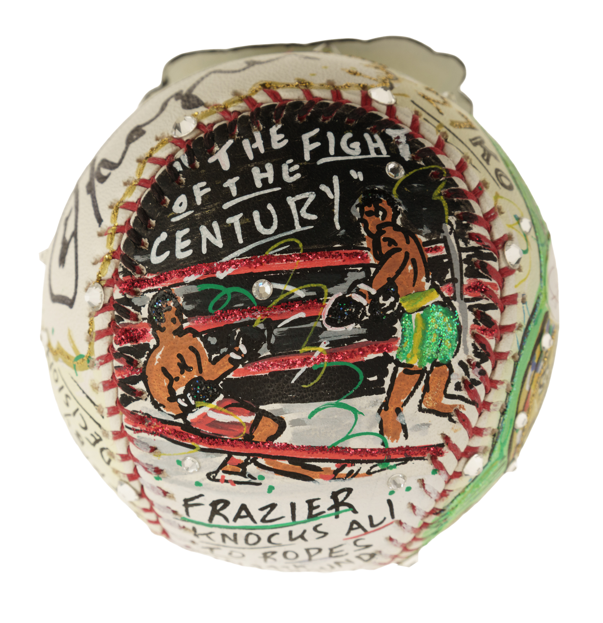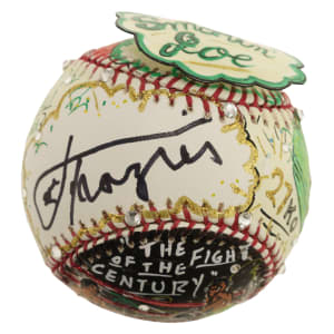Charles Fazzino mixed-media artwork on a regulation baseball signed by Joe Frazier in black marker. Also signed by Fazzino on a separate panel. This is one of the most unusual Joe Frazier signed pieces we have seen. The colorful 3D artwork on the ball commemorates Frazier's Hall of Fame career both in pictures and words. Charles Fazzino is a world-renowned pop artist who is best known today for his stunning 3D giclees. All of Fazzino's 3D artworks are meticulously pieced together by the artist and then hand embellished with the application of acrylic paint glitter and often crystals. Near Mint condition overall. Auction LOA from James Spence/JSA. A James/Spence JSA certification sticker is affixed to the ball.