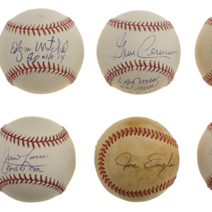 Collection of five single-signed baseballs and one dual-signed baseball, all signed by a different U.S. astronaut. Each of these astronauts and their accomplishments will be familiar to any fan of space exploration. All the signatures appear on an official American, National, or Major League Baseball ball dating from the 1980s or later. Two of the balls have varying degrees of age toning; otherwise in Excellent to Near Mint condition overall. This collection consists of the following: 1) Official Major League baseball (Selig) signed in blue ink by Jim Lovell across the sweet spot. Lovell has added the inscription "Apollo 13 CDR" below his signature. 2) Official American League baseball (Budig) signed in blue ink by Charles Conrad across the sweet spot. Conrad has added the inscription "Cdr. Apollo XII" below his signature. 3) Official Major League baseball (Selig) signed by Edgar Mitchell in blue ink across the sweet spot. Mitchell has added the inscription "Apollo 14" below his signature. 4) Official Major League baseball (Selig) signed in blue ink by Gene Cernan across the sweet spot. Cernan has added the inscription "Last man on moon/Apollo XVII" below his signature. 5) Official National League baseball (White) signed in blue ink by Alan Shepard across the sweet spot. 6) National League baseball (Feeney) signed in black ink by Joe Engle along one side panel and Richard Truly along another.Total: 6 balls. Auction LOA from James Spence/JSA.