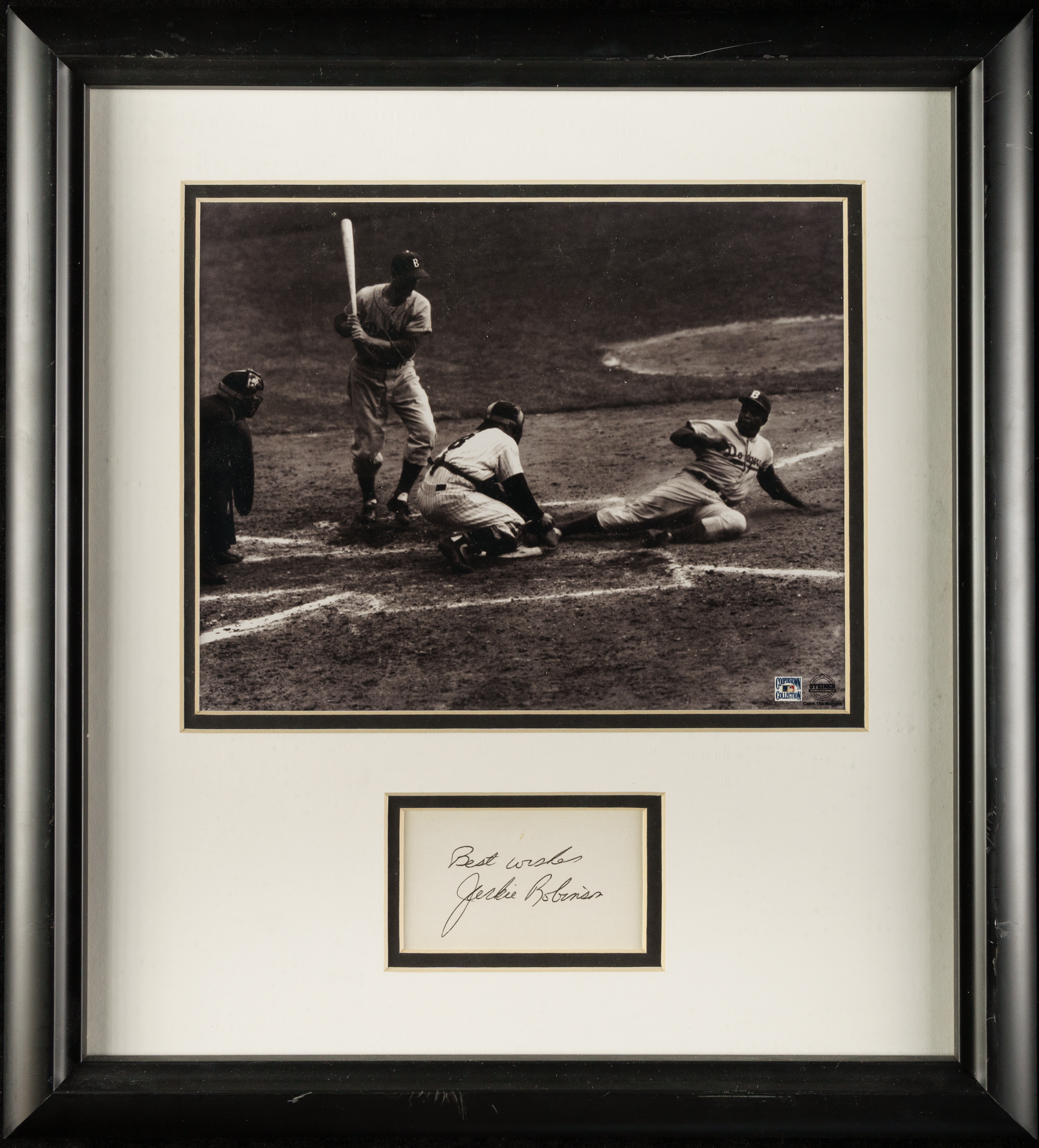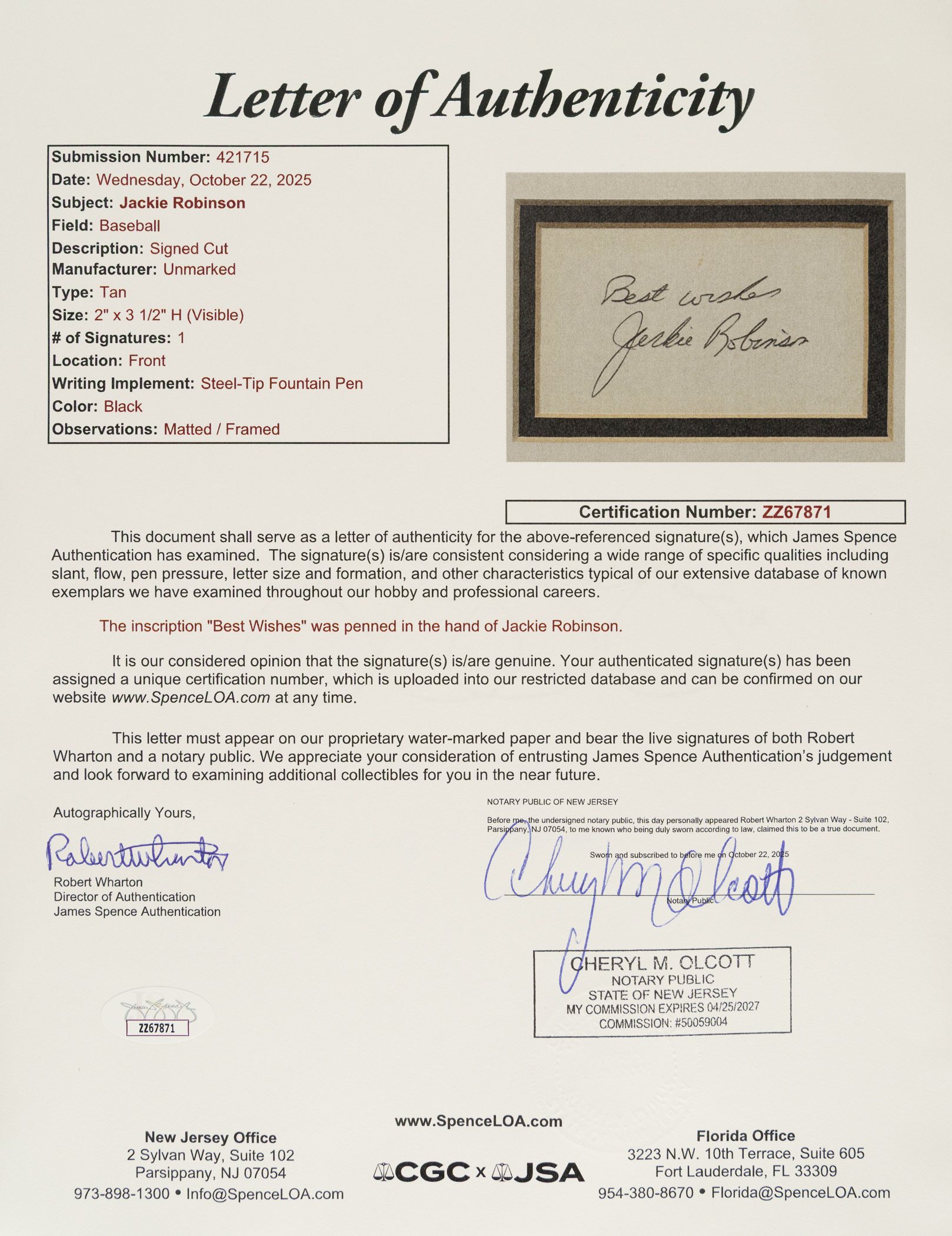 Cut signature of Brooklyn Dodgers Hall of Famer Jackie Robinson. Signed "Best Wishes/Jackie Robinson" in black ink. The cut has been framed together with a black-and-white photo (modern print) of Robinson. The cut (3-5/8 x 2 inches) is in apparent Very Good to Excellent condition. Matted and framed to total dimensions of 15 x 16 inches. Full LOA from James Spence/JSA. The size/weight of this item requires that there will be an additional shipping charge for this lot.