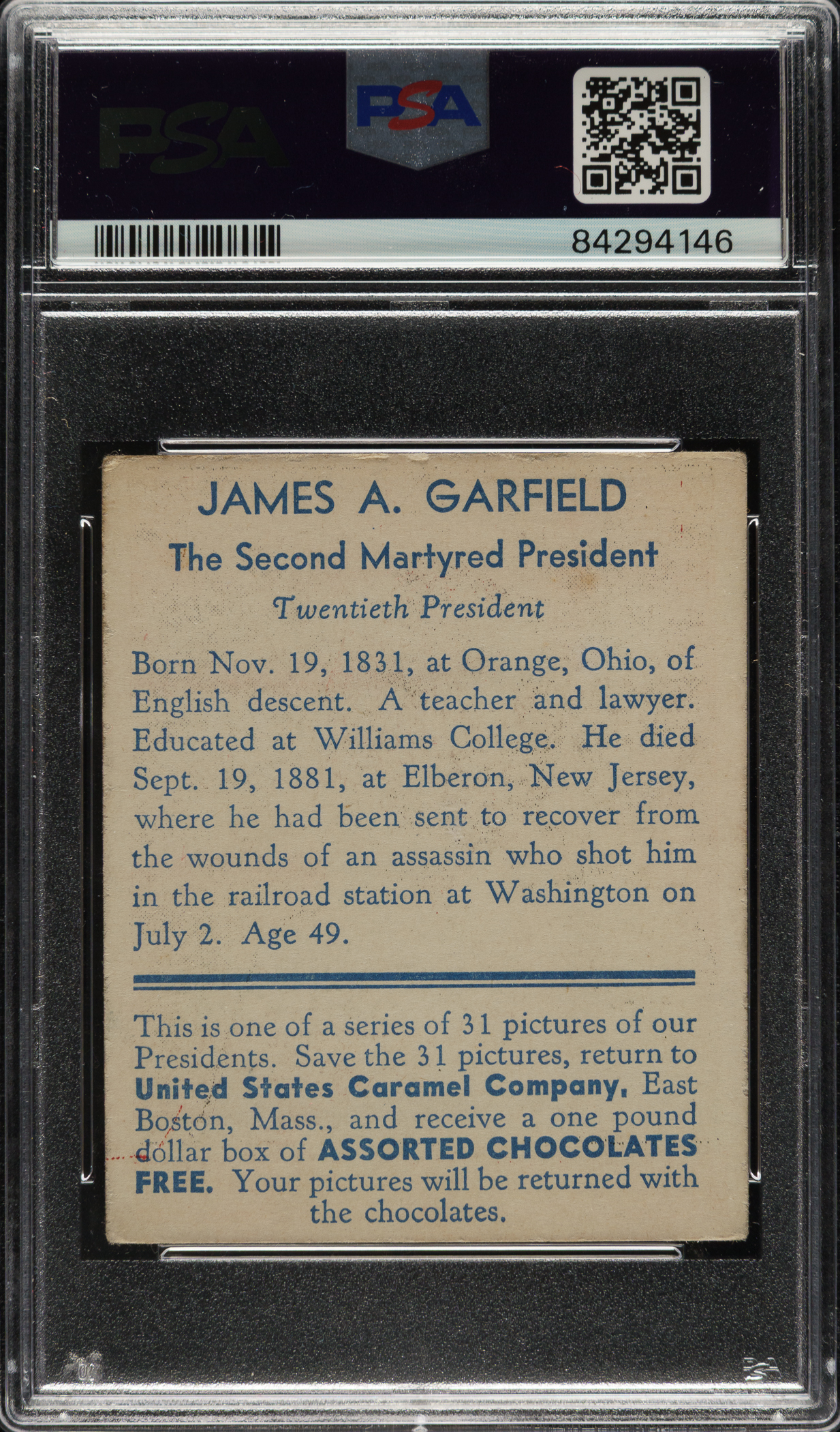 Lot # 4254: 1932 R114 U.S. Caramel "Presidents" James Garfield PSA VG 3