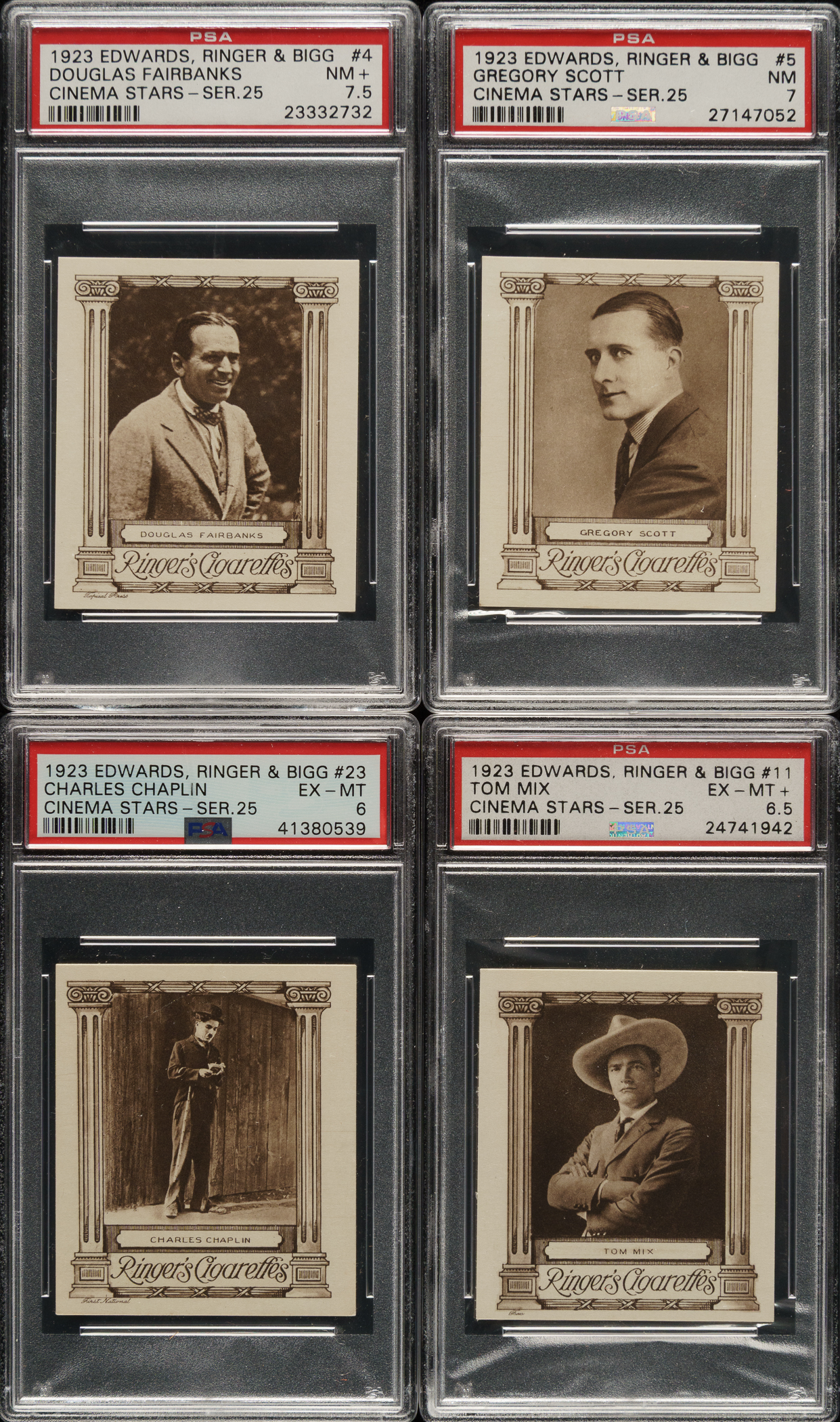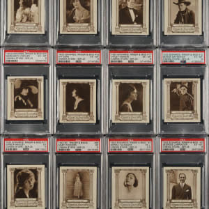 Partial set (16/25) of 1923 Edwards, Ringer & Bigg Cinema Stars cards, each graded and encapsulated by PSA. PSA Grading Composite: NM+ 7.5 (1 card): #4. NM 7 (4 cards): #5, 8, 15, and 16. EX-MT+ 6.5 (2 cards): #3 and 11. EX-MT 6 (6 cards): #7, 12, 17, 18, 23 Chaplin, and 24. EX+ 5.5 (1 card): #2. EX 5 (2 cards): #21 and 25. Total: 16 cards. The size/weight of this item requires that there will be an additional shipping charge for this lot.