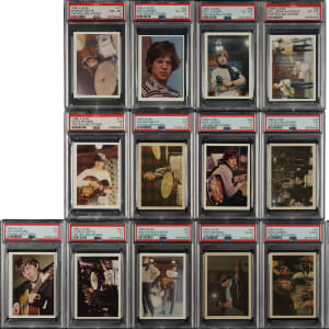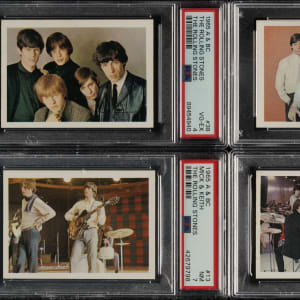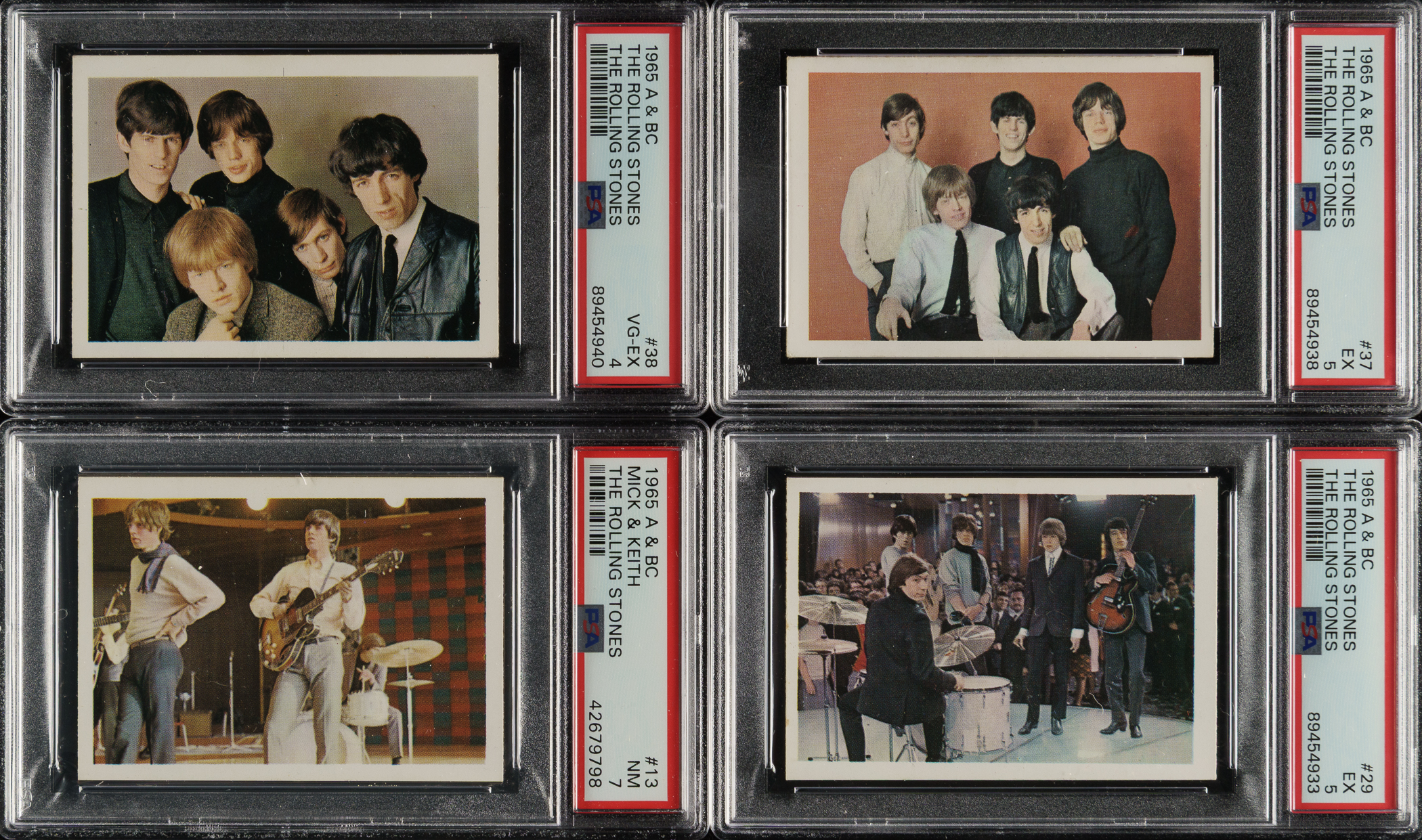 Collection of eighteen1965 A & BC "The Rolling Stones" cards, each graded and encapsulated by PSA. PSA Grading Composite: NM-MT 8 (1 card): #17. NM7 (1 card): #13. EX-MT 6 (3 cards): #25, 26, and 30. EX 5 (8 cards): #11, 14, 28, 29, 32, 33, 34, and 37. VG-EX 4 (4 cards): #20, 27, 37, and 38. VG 3 (1 card): #12. Total: 18 cards. The size/weight of this item requires that there will be an additional shipping charge for this lot.