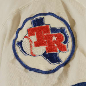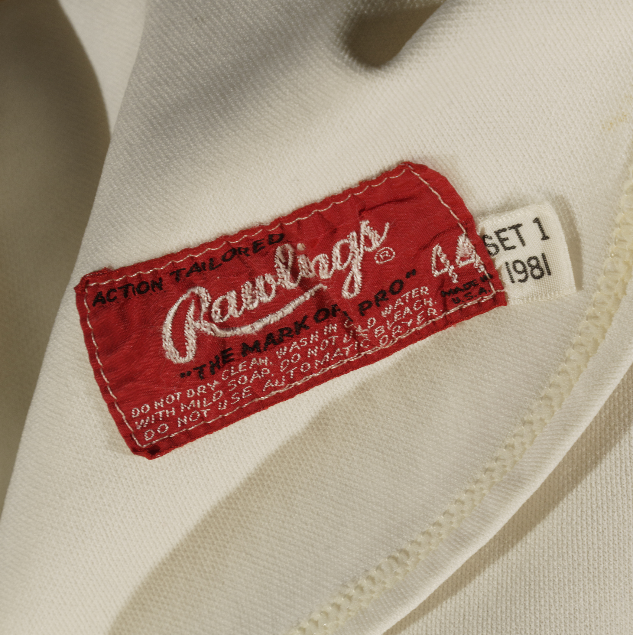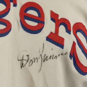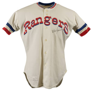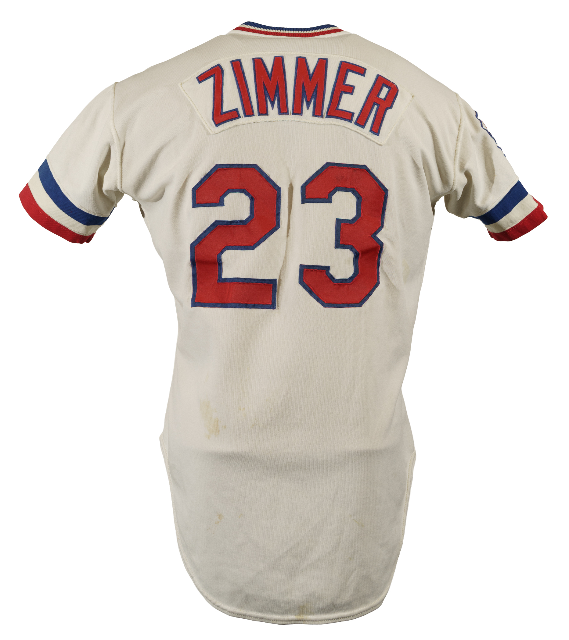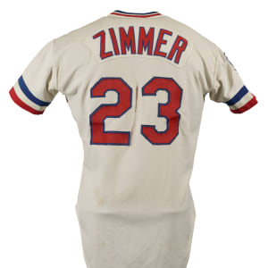 Texas Rangers home jersey worn by manager Don Zimmer during the 1981 season. The white knit jersey is lettered "Rangers" across the front and features the number "23" on the reverse. All letters and numerals are appliquéd in red on blue tackle twill. The team's logo adorns the right sleeve. A "Rawlings 44" label and a "Set 1 1981" flag tag appear along the reverse of the right front tail. Zimmer has signed the jersey in black marker on the front. The jersey is original as issued, with no alterations, and displays light-to-moderate wear, with scattered patches of light staining. Auction LOA from James Spence/JSA (for the autograph only).