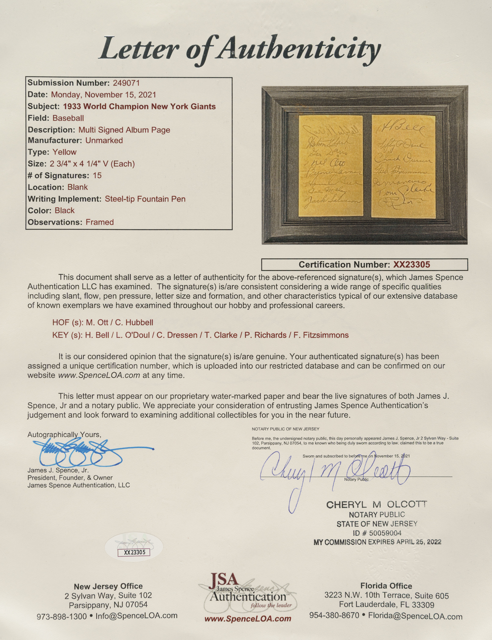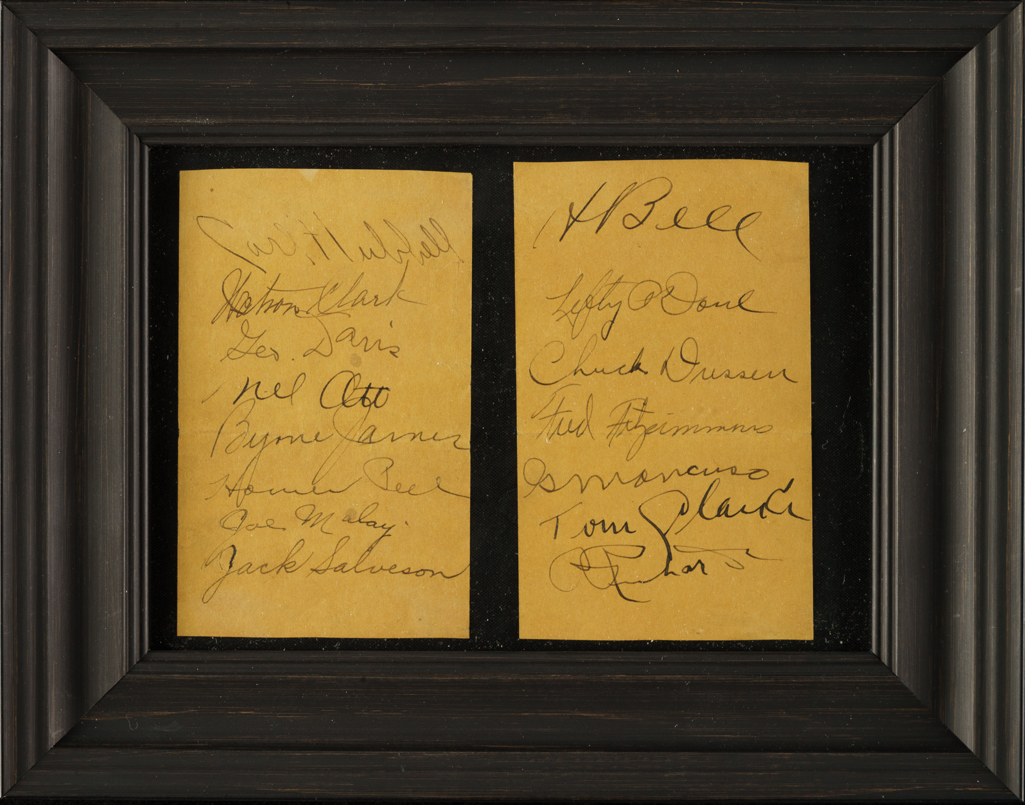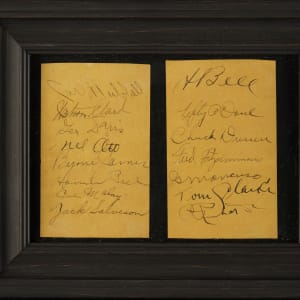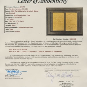 Pair of album pages signed in black ink by 15 members of the 1933 World Champion New York Giants. Notable signatures include Hubbell, Ott, O'Doul, Dressen, Fitzsimmons, Bell, James, and Richards. The pages (2.75 x 4.25 inches) are in Very Good condition. Framed to total dimensions 9.25 x 7.25 inches. Full LOA from James Spence/JSA.