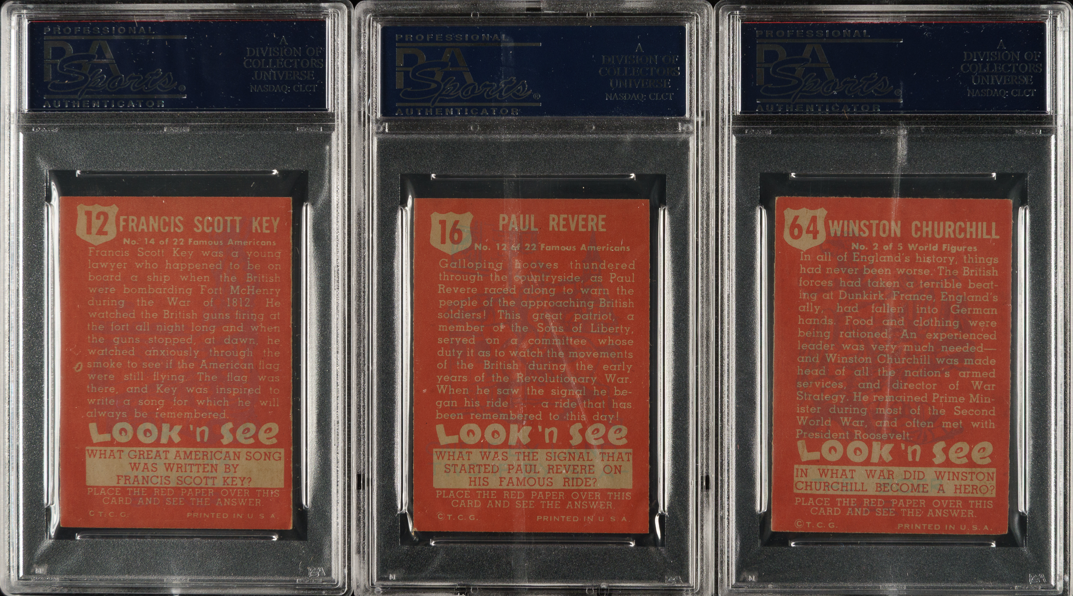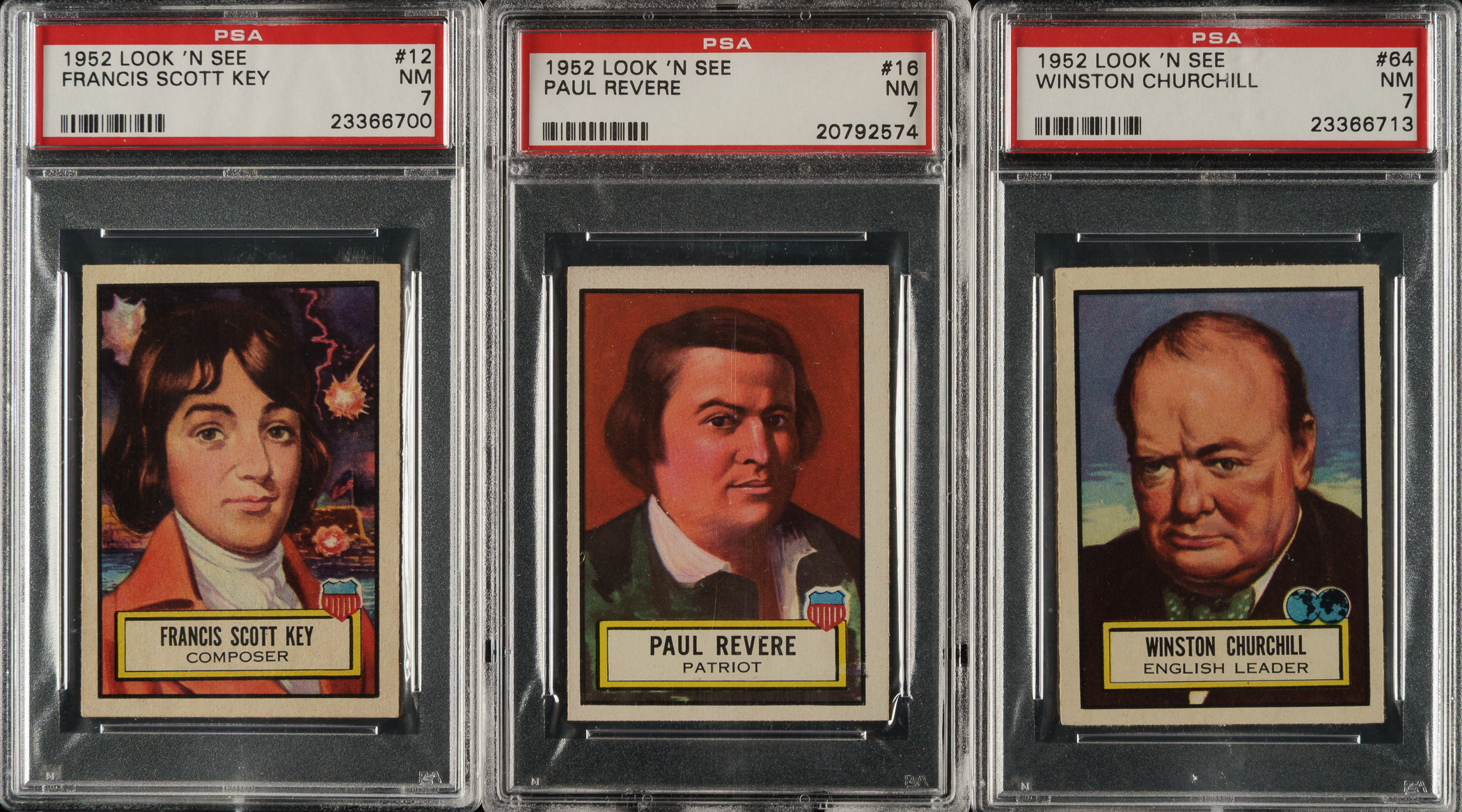 Trio of 1952 Topps "Look 'N See" cards, each graded and encapsulated NM 7 by PSA. This trio consists of the following: #12, 16 and 64. Total: 3 cards.