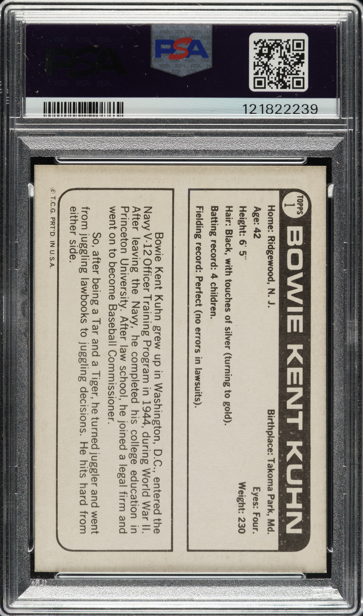 Rare signed example of Major League Baseball Commissioner Bowie Kuhn's 1969 Topps Test card. Following Kuhn's election to the post, Topps issued a one-card "set" showing Kuhn's head superimposed on a ballplayer's body with a crown atop his head. The black-and-white card is scarcely encountered and a must-have for any complete Topps collection. Kuhn has signed the card in black Sharpie along the right side. PSA/DNA has encapsulated the card, grading the signature GEM MINT 10. A superb signed example of this eclectic Topps card!