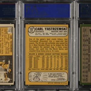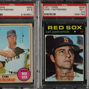 Trio of 1963 to 1971 Topps cards, featuring Boston Red Sox Hall of Famer Carl Yastrzemski. Each card has been graded and encapsulated by PSA. This trio consists of the following: 1) 1963 Topps #115 Carl Yastrzemski (EX 5). 2) 1968 Topps #250 Carl Yastrzemski (EX 5). 3) 1971 Topps #530 Carl Yastrzemski (EX+ 5.5). Total: 3 cards.