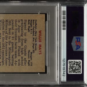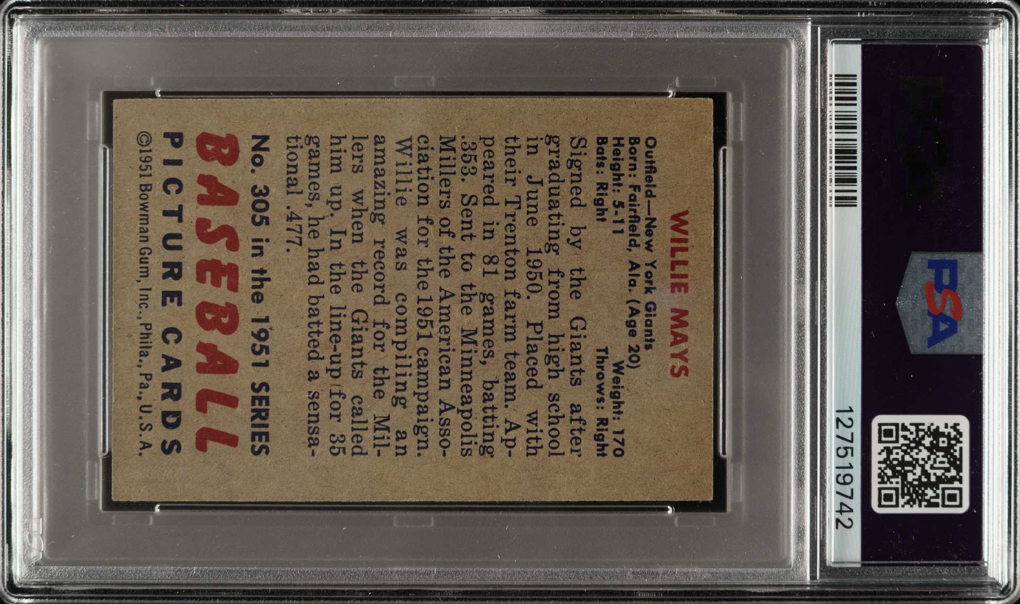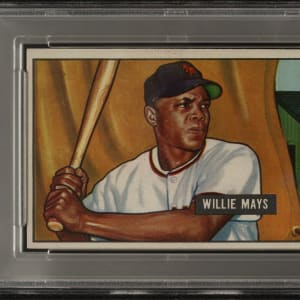 Graded NM 7 by PSA. Outstanding high-grade example of one of card collecting's greatest classics, and Willie Mays' first and true rookie card. The 1951 Bowman of Willie Mays has been firmly established as one of the most famous and desirable of all baseball cards. In addition to being one of the two key cards of the 1951 Bowman set, Mays is also part of the scarce high-number series of the set (#253-324). This is a remarkable card. The offered example is crisp and clean, with strong corners, exceptional printing registration, and impressive centering. The reverse is crisp and clean, without even the slightest trace of the gum or wax staining that so frequently affects 1951 Bowmans. A fantastic opportunity to acquire a very attractive high-grade example of New York Giants Hall of Famer Willie Mays' rookie card.