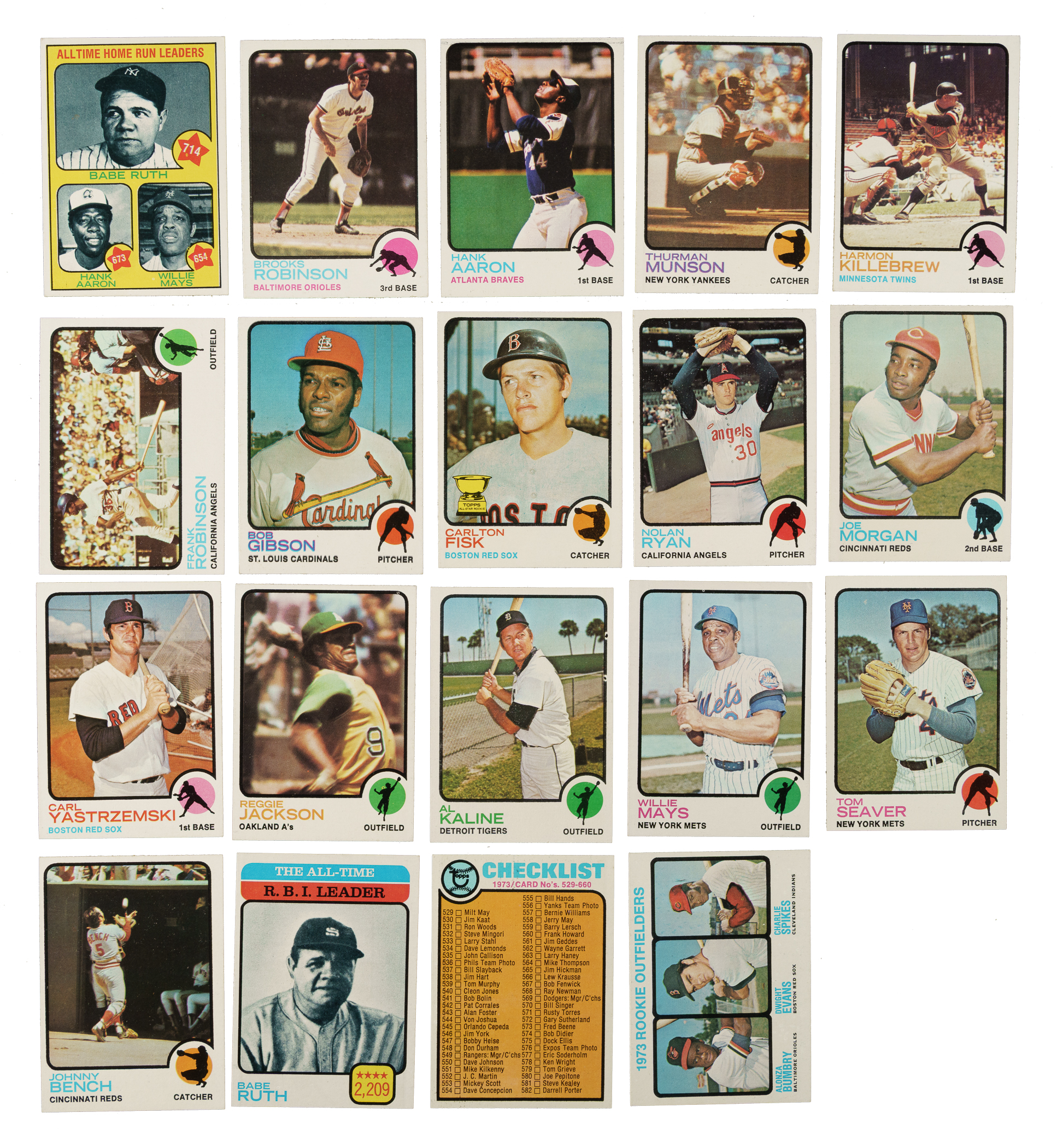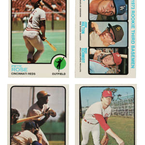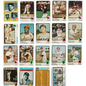 Presented is an impressive mid- to high-grade complete set of the 1973 Topps series consisting of 660 different cards. The rookie cards of Hall of Famers Mike Schmidt and Rich Gossage, as well as the final cards of Roberto Clemente and Willie Mays, highlight the 1973 Topps issue, one of the most popular sets of the 1970s. Condition is 31% Nr/Mt to Nr/Mt-Mt (approximately two-thirds Nr/Mt), 60% Ex to Ex-Mt, and 9% Vg to Vg-Ex. Keys: #1 Ruth/Mays/Aaron (Ex), 50 Clemente (Nr/Mt), 100 Aaron (20/80 T/B, otherwise Ex-Mt), 130 Rose (Ex), 174 Gossage RC (Ex+), 193 Fisk (Nr/Mt), 220 Ryan (Nr/Mt), 280 Kaline (Nr/Mt), 305 Mays (Vg-Ex+), 380 Bench (Ex-Mt), 588 Checklist (Nr/Mt), 614 Evans RC (Ex+), and 615 Schmidt RC (Ex). This is an extremely attractive 1973 Topps complete set with numerous highlights. Total: 660 cards.