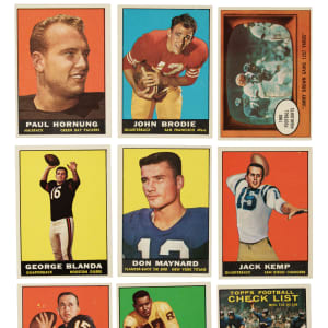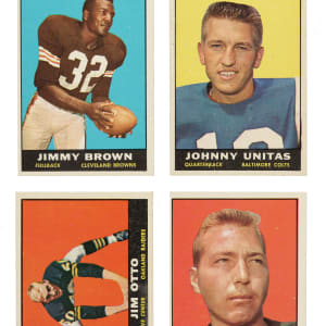 Complete 198-card set of 1961 Topps football. The 1961 Topps football set is one of the most popular of the decade for its simple design, crisp images, and brilliant colors. Condition is 23% Ex-Mt to Nr/Mt, 66% Vg-Ex to Ex, and 11% Gd to Vg (including a couple lesser, a couple with a slight trim, and a few with a slight miscut). Keys: #1 Unitas (Vg-Ex), 39 Starr (Vg+), 40 Hornung (Vg-Ex), 59 Brodie RC (Ex), 71 Brown (Ex+), 77 Brown IA (Ex+), 145 Blanda (Nr/Mt), 150 Maynard RC (Nr/Mt), 166 Kemp (Ex), 182 Otto RC (Vg-Ex), 186 Flores RC (Vg-Ex), 190 L. Taylor RC (Ex), and 198 Checklist (Vg-Ex+). Very attractive complete 1960s Topps football set, including many Hall of Famers and stars of the era. Total: 198 cards.