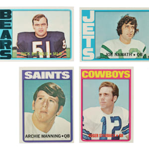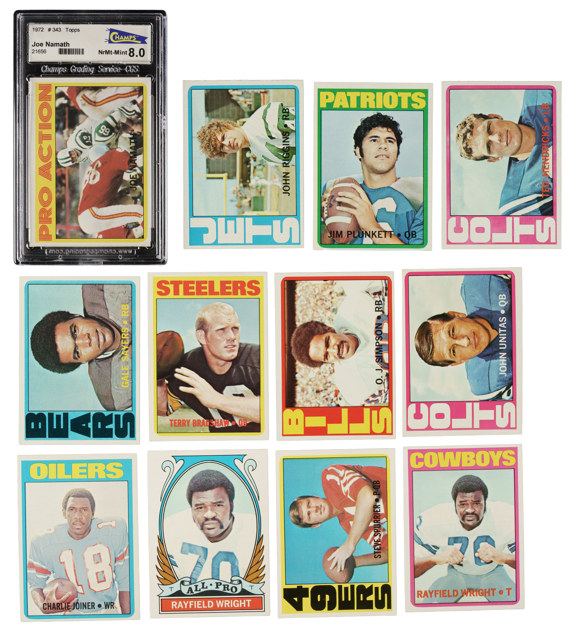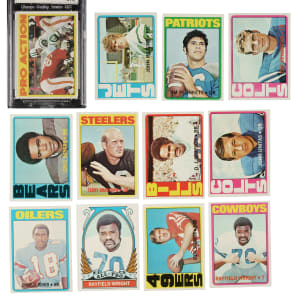 Complete 351-card set of 1972 Topps football, highlighted by all of the stars and Hall of Famers of the era, including Roger Staubach (rookie), Rayfield Wright (rookie), Joe Namath, and Terry Bradshaw. The scarce high-number series (#264-351) makes complete 1972 sets relatively rare for the era. The condition of the low- and middle-number cards (#1-263) is 40% Nr/Mt to Nr/Mt-Mt (including a few Mint), 53% Ex to Ex-Mt, and 7% Vg to Vg-Ex. The condition of the high-number cards (#264-351) is 59% Nr/Mt to Nr/Mt-Mt (including a few bordering on Mint) and 41% Ex to Ex-Mt (including a couple slightly lesser). Keys: #13 Riggins RC (Nr/Mt), 55 Manning RC (Ex due to centering), 65 Plunkett RC (80/20 T/B, otherwise Nr/Mt-Mt), 93 Hendricks RC (Nr/Mt), 100 Namath (Ex-Mt), 110 Sayers (Ex-Mt), 150 Bradshaw (Ex+), 160 Simpson (75/25 T/B, otherwise Nr/Mt-Mt), 165 Unitas (Ex-Mt), 170 Butkus (Nr/Mt), 200 Staubach RC (70/30 T/B, otherwise Nr/Mt), 244 Joiner RC (70/30 T/B, otherwise Nr/Mt), 266 Wright AP (Ex+), 291 Spurrier RC (Ex), 316 Wright RC (Ex), and 343 Namath Action (Nr/Mt, card resides in a Champs slab). An outstanding mid- to high-grade complete set of this popular football issue. Total: 351 cards.