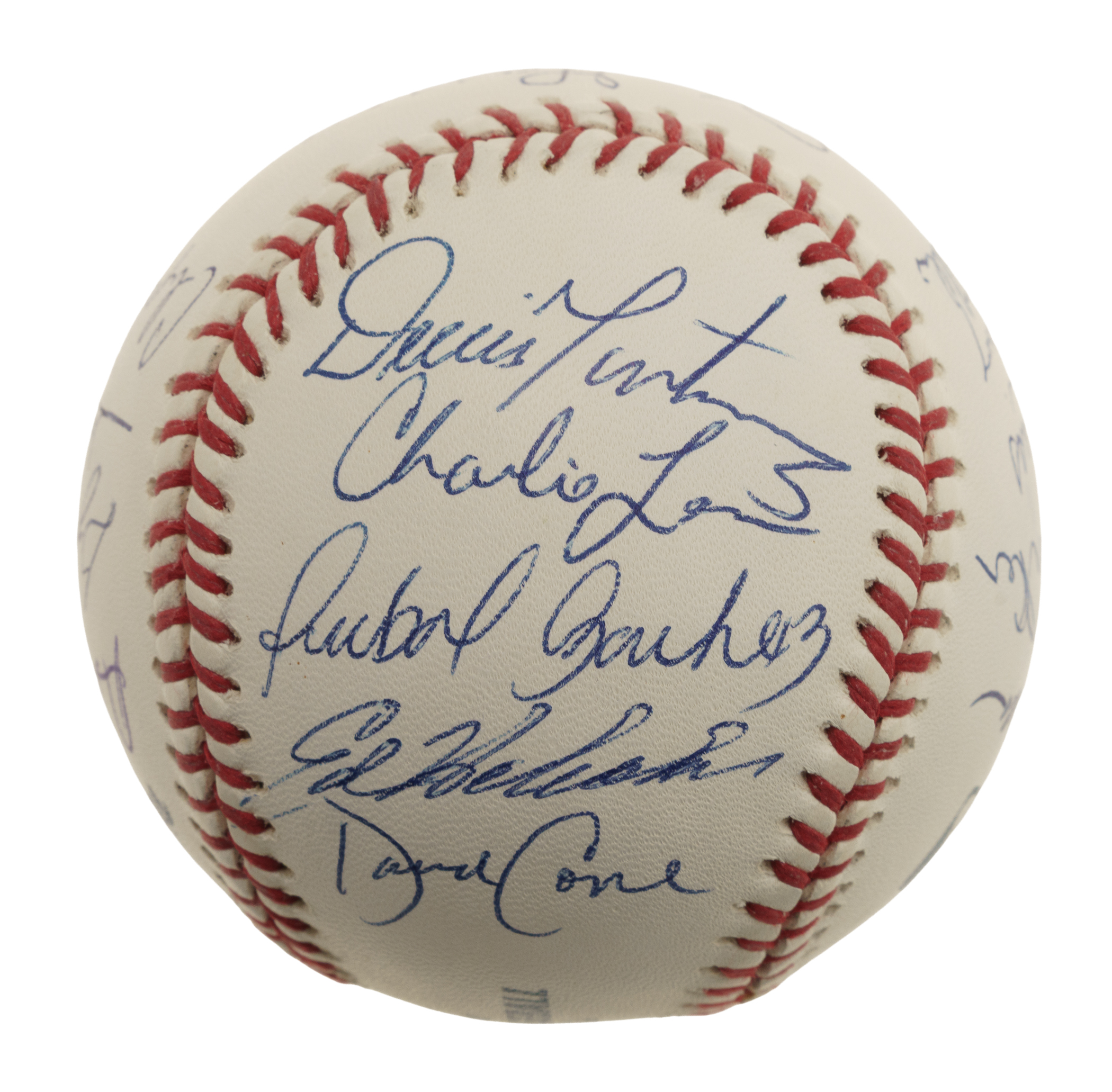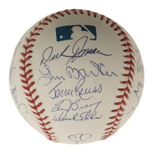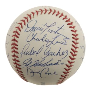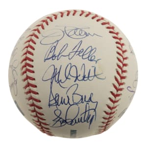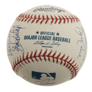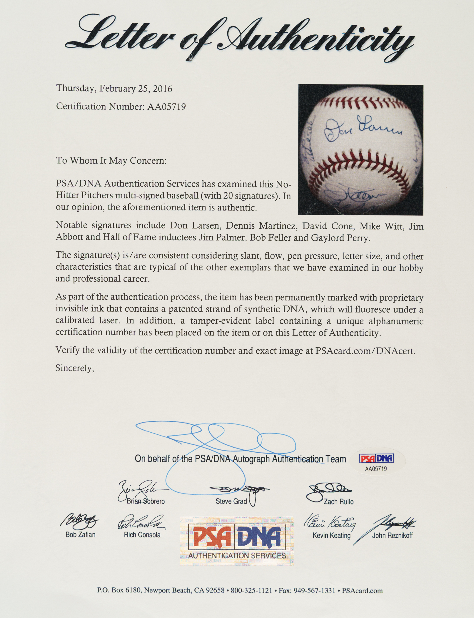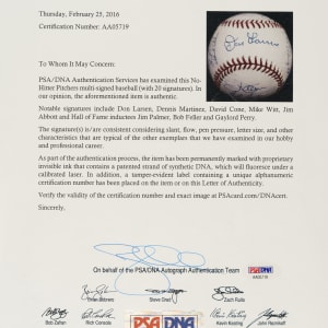 Official Major League baseball (Selig) signed in blue ink by 20 pitchers who have pitched no-hitters. Notable signatures include Don Larsen (sweet spot), Dennis Martinez, David Cone, Mike Witt, Jim Abbott, Jim Palmer, Bob Feller, and Gaylord Perry. Near Mint condition overall. Full LOA from PSA/DNA.