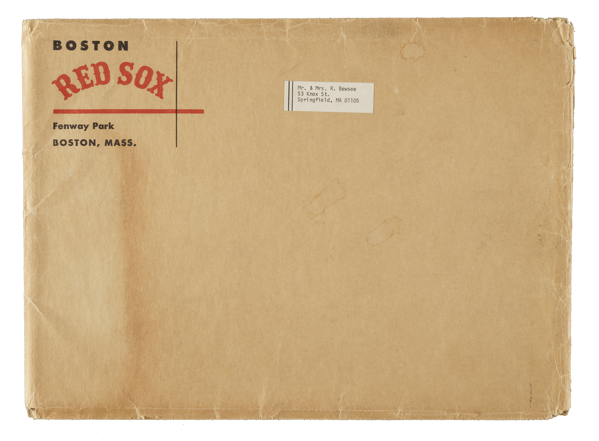 Complete set of 1947 Boston Red Sox Picture Pack baseball cards plus an original envelope, highlighted by Ted Williams, Joe Cronin, and Bob Doerr. Condition of the set ranges from Vg-Ex to Ex-Mt (averaging Ex), including one higher. Condition of the envelope is Gd. Keys: Cronin (Vg-Ex), Doerr (light mark on reverse, otherwise Ex-Mt), and Williams (Ex+). Total: 25 cards. The size/weight of this item requires that there will be an additional shipping charge for this lot.