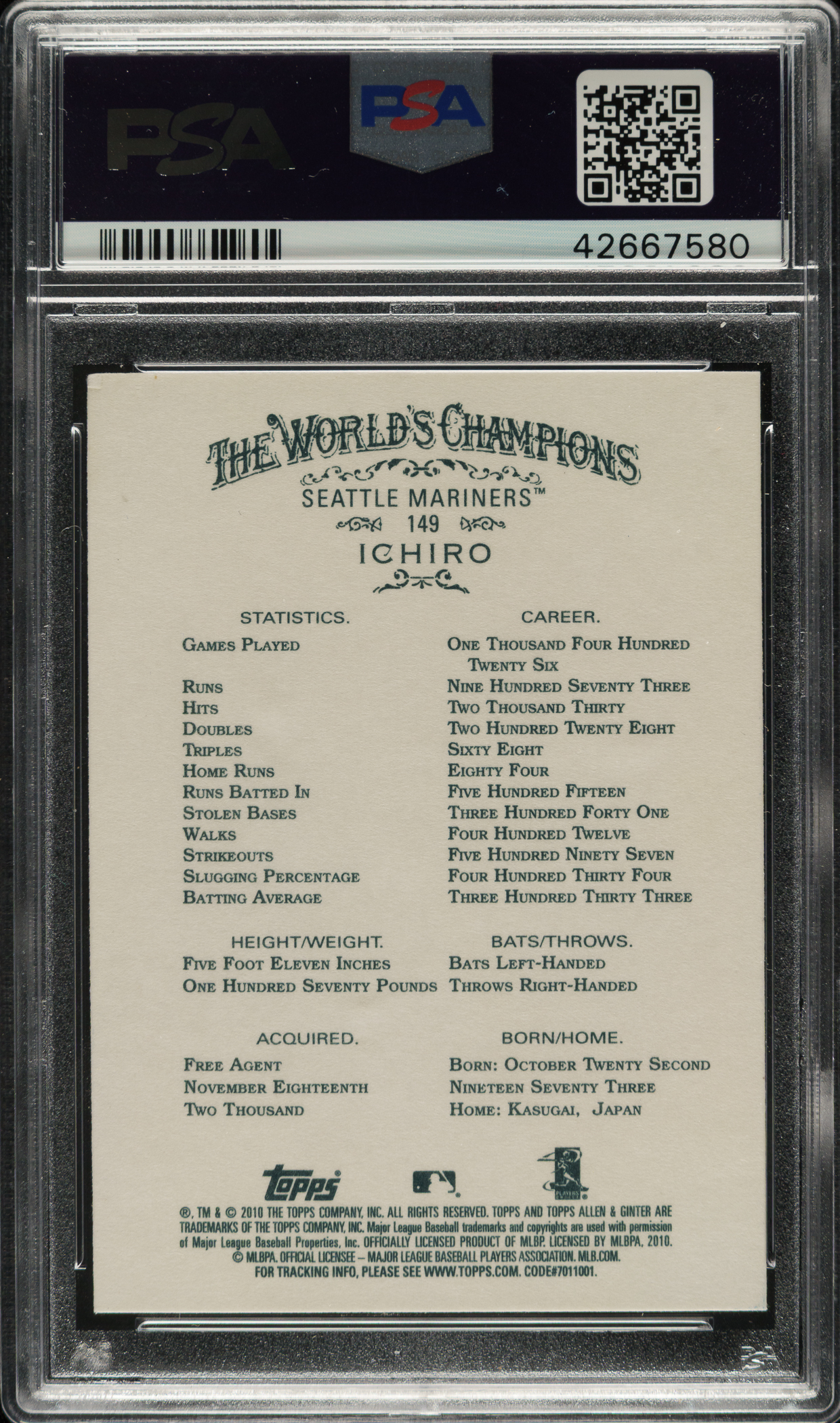 PSA/DNA has encapsulated the card, grading the signature Authentic. Seattle Mariners Hall of Famer Ichiro Suzuki.