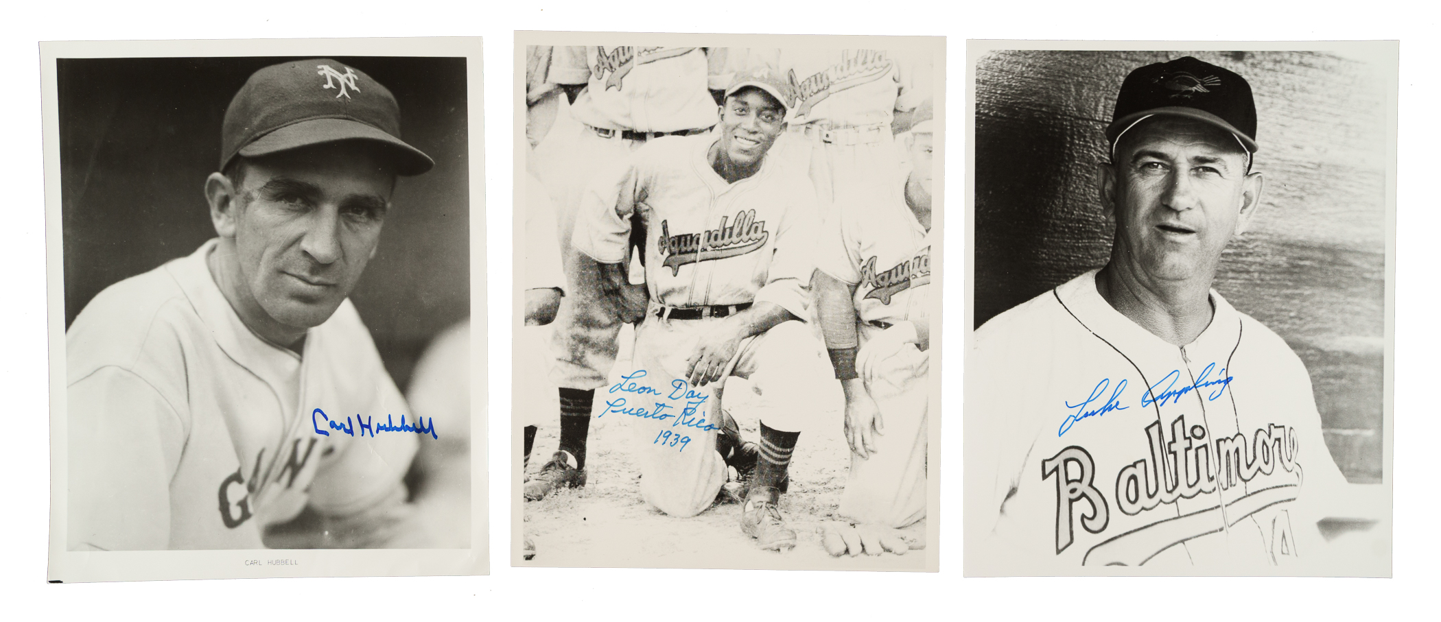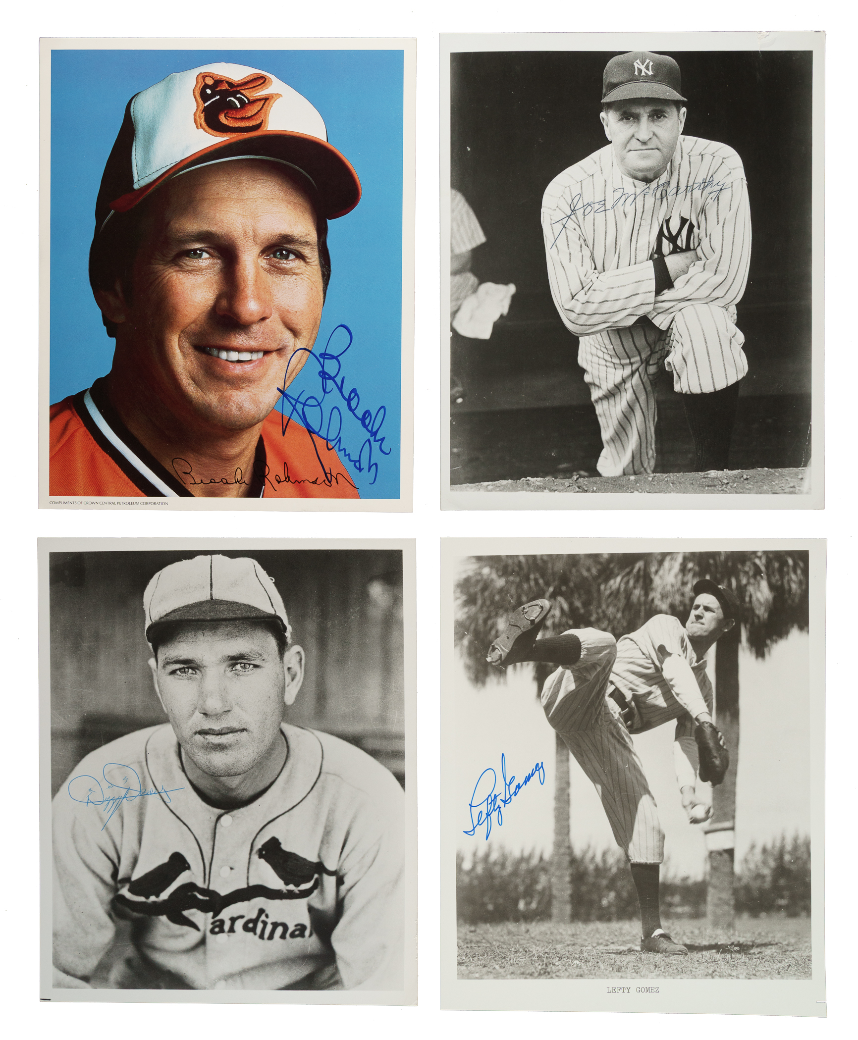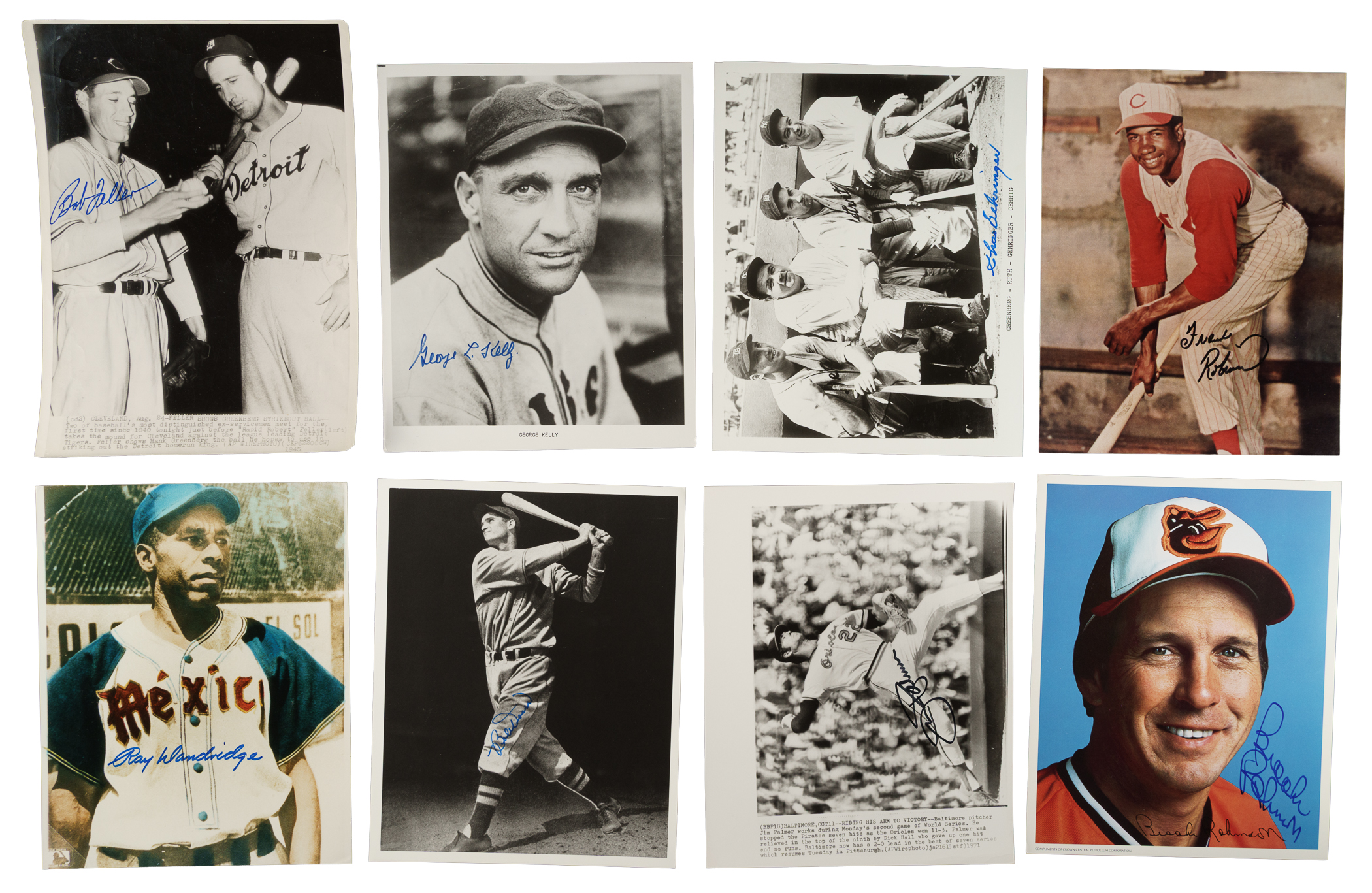 Collection of fifteen photographs, both color and black-and-white, each signed on the front by the player pictured. The signatures are scripted almost exclusively in either blue or black ink. The photographs are all modern prints, all measure around 8 x 10 inches, and are in Excellent condition overall (with one lesser). This collection consists of the following: Appling, Dandridge, Day (inscribed "Puerto Rico 1939"), Dean, Doerr, Feller (photo of Feller and Greenberg, 8 x 11 inches), Gehringer (photo of Greenberg/Ruth/Gehringer/Gehrig), Gomez, Hubbell, Kelly, McCarthy, Palmer, two B. Robinson, and F. Robinson. Total: 15 signed photographs. Auction LOA from James Spence/JSA.