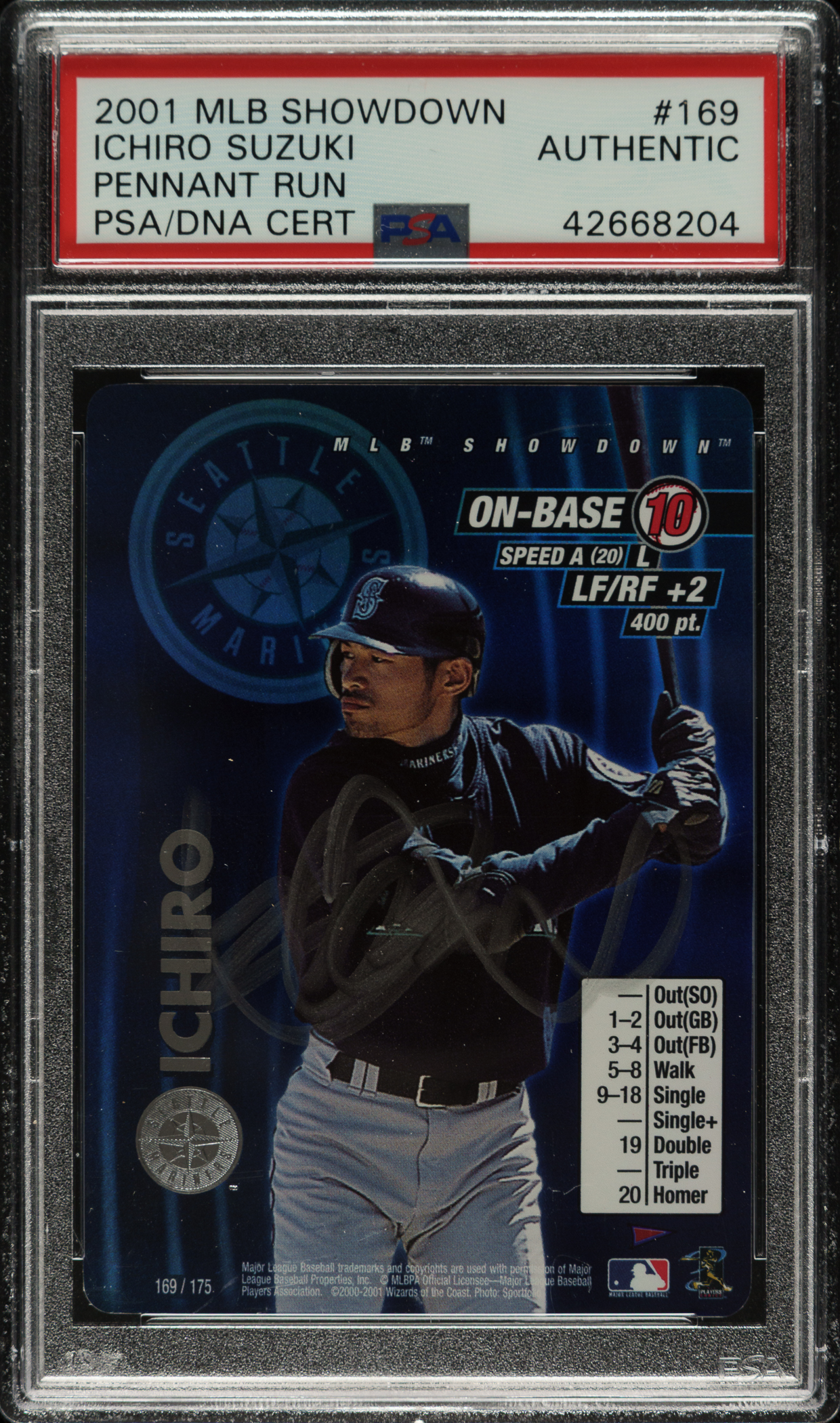 PSA/DNA has encapsulated the card, grading the signature Authentic. Seattle Mariners Hall of Famer Ichiro Suzuki.