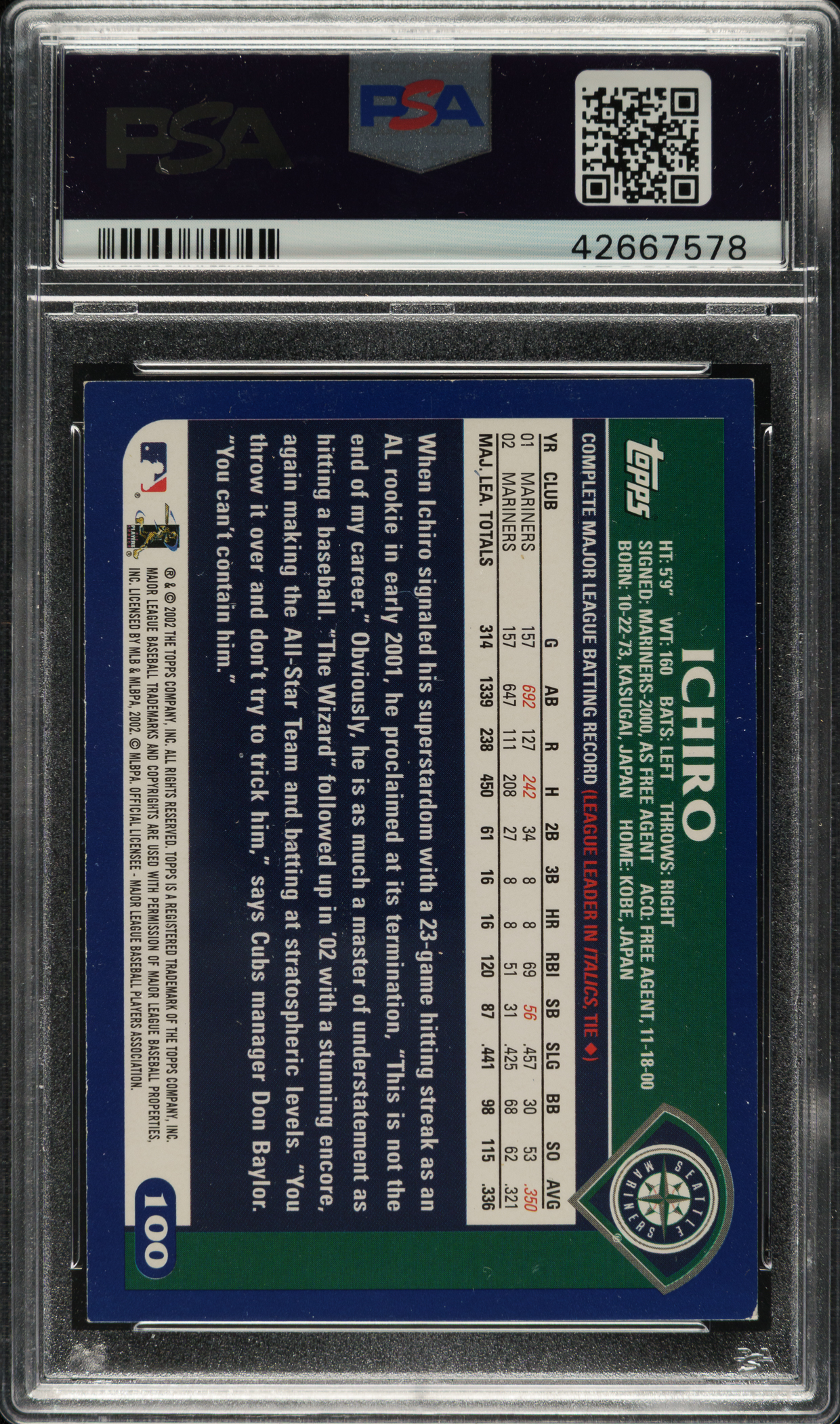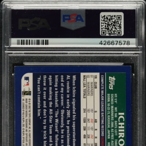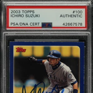 PSA/DNA has encapsulated the card, grading the signature Authentic. Seattle Mariners Hall of Famer Ichiro Suzuki.