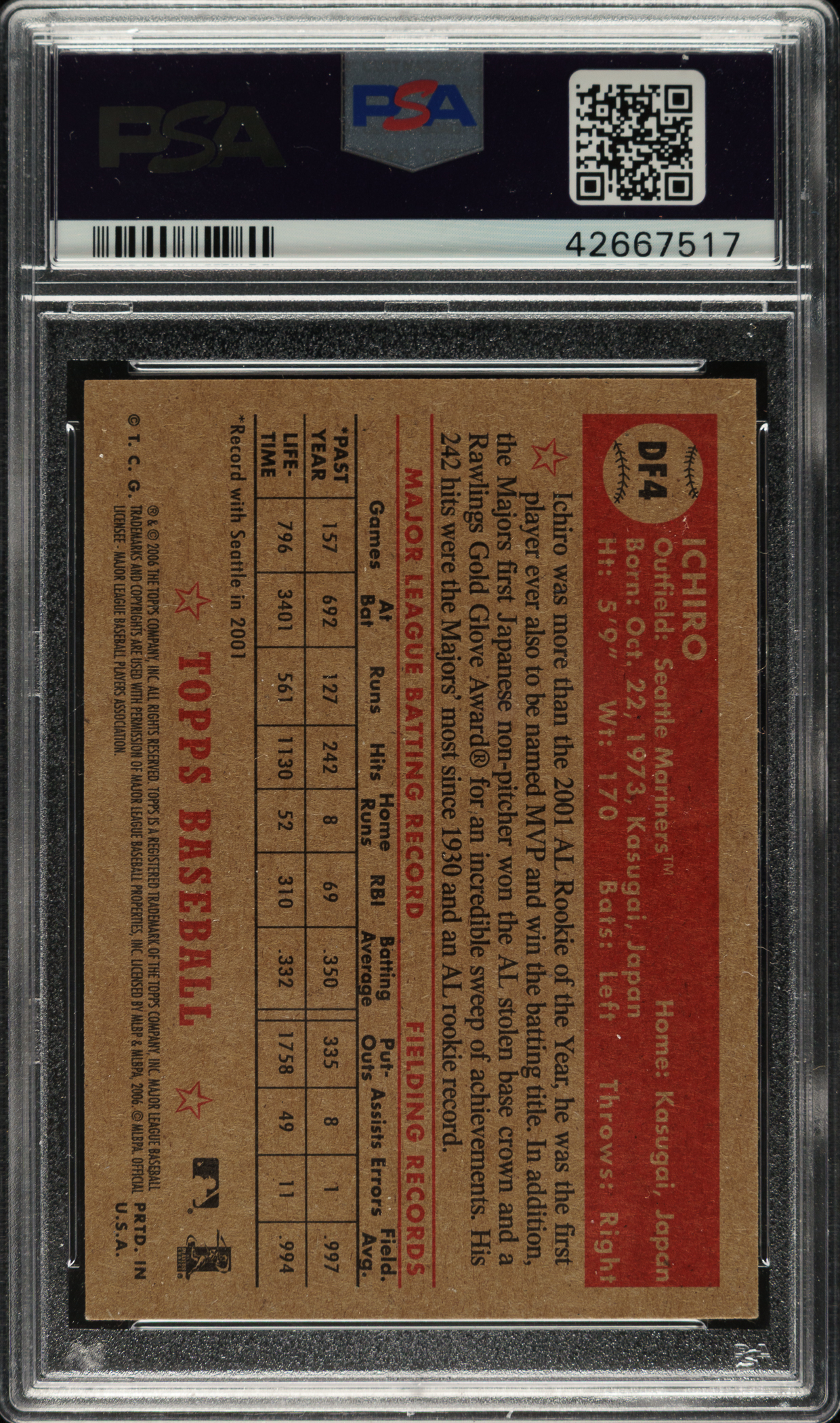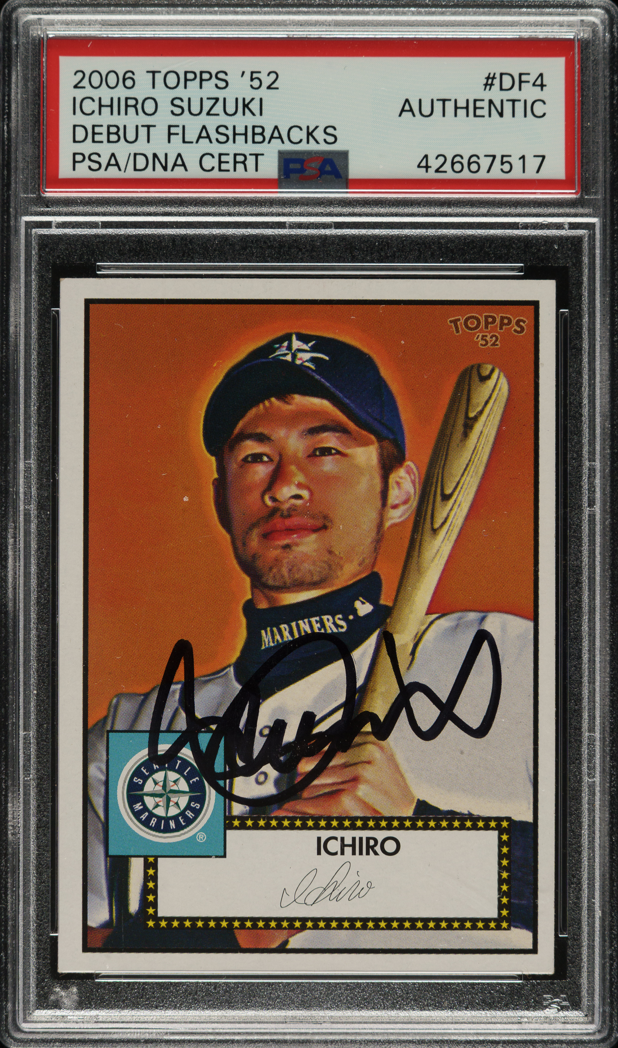 PSA/DNA has encapsulated the card, grading the signature Authentic. Seattle Mariners Hall of Famer Ichiro Suzuki.