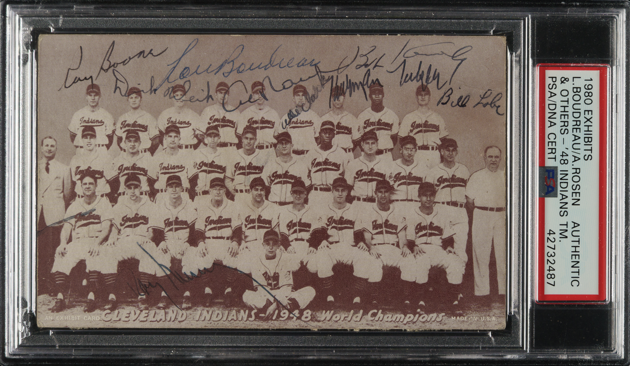 PSA/DNA has encapsulated the card, grading the signatures Authentic. Includes the following signatures: Lou Boudreau, Thurman Tucker, Al Rosen, Ray Boone, Allie Clark, Bob Kennedy, Bill Lobe, Ray Murray, and Dick Weik. Total: 9 signatures.