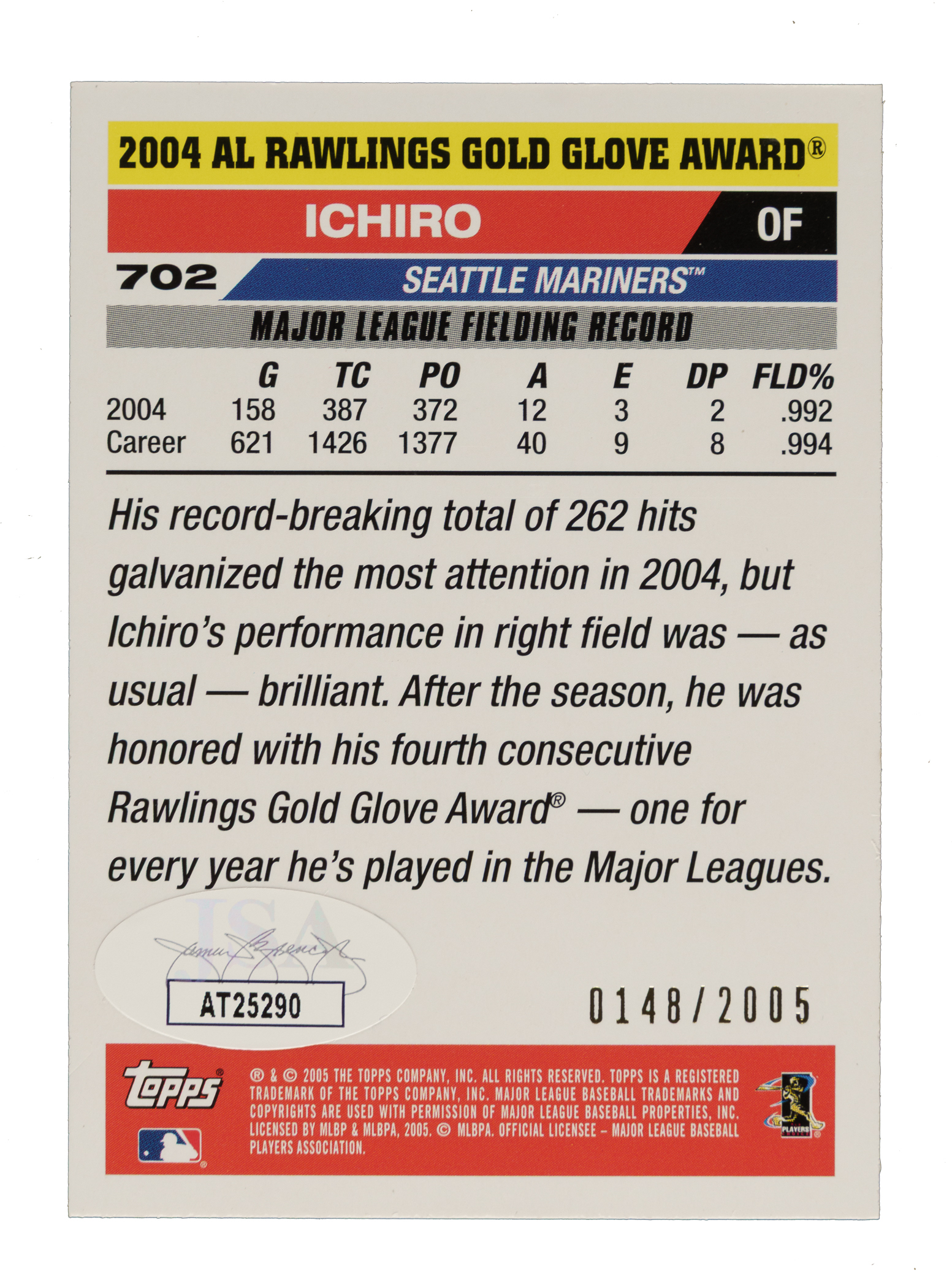 Seattle Mariners Hall of Famer Ichiro Suzuki. Condition is cert sticker on reverse, otherwise Nr/Mt. Basic certification from James Spence/JSA.