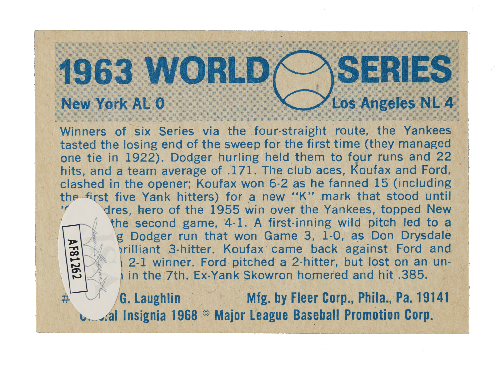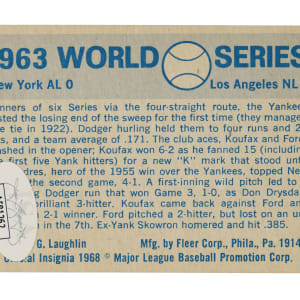 Los Angeles Dodgers Hall of Famer Sandy Koufax. Condition is cert sticker on reverse, otherwise Ex-Mt. James Spence/JSA certification sticker is affixed to the card.