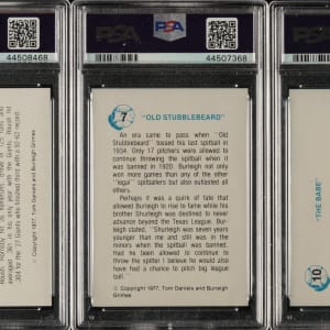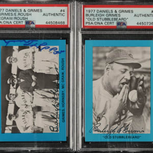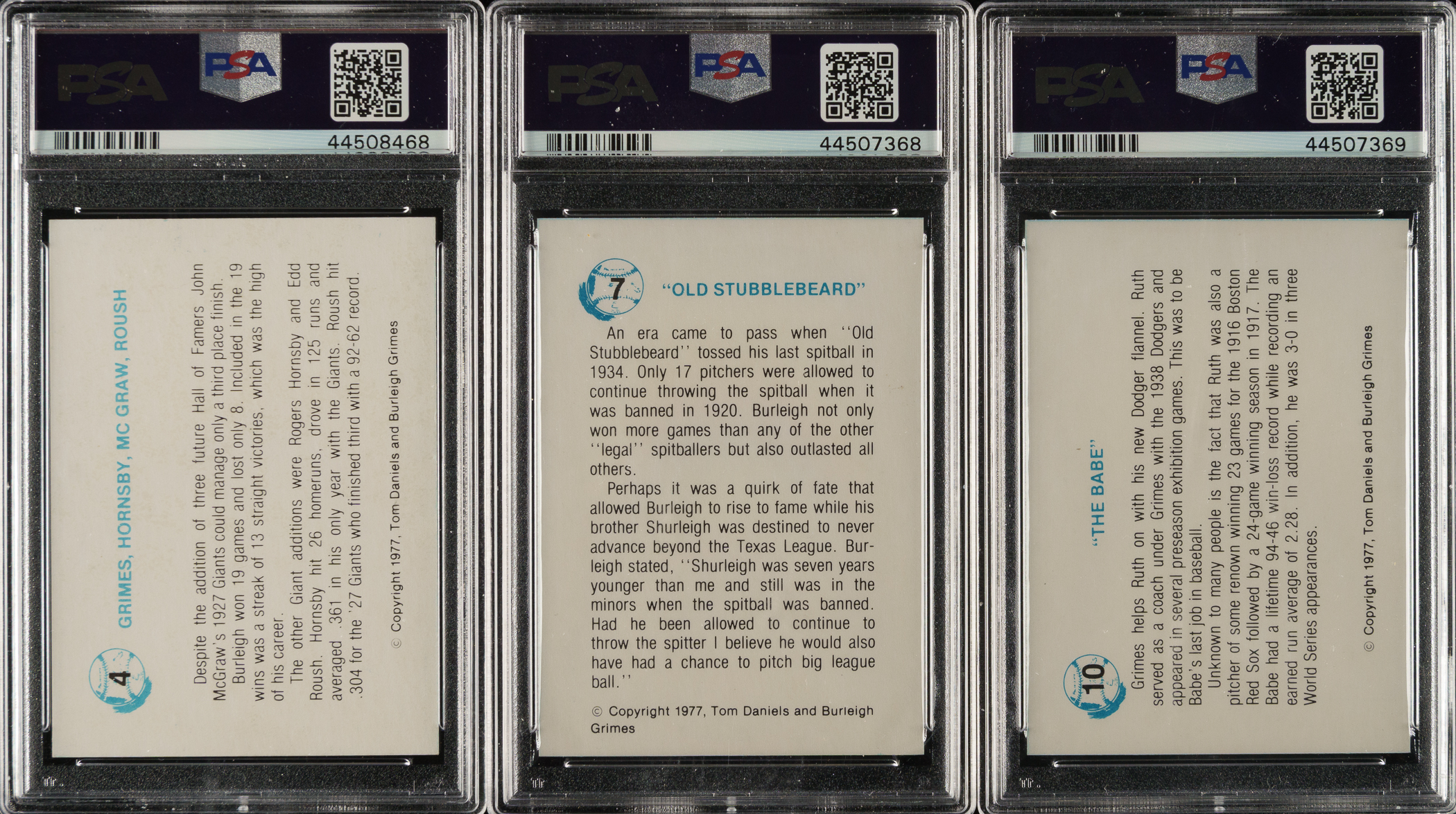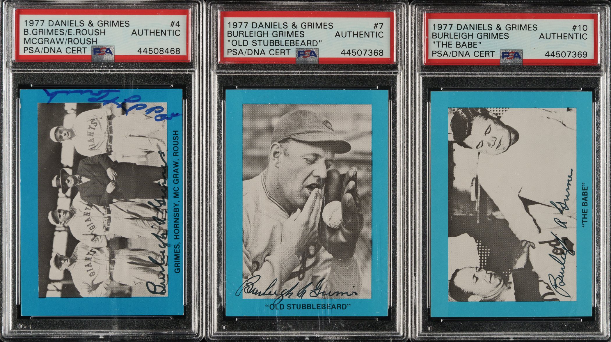 Trio of signed 1977 Tom Daniels & Burleigh Grimes cards, featuring Brooklyn Dodgers Hall of Famer Burleigh Grimes. PSA/DNA has encapsulated the cards, grading the signatures Authentic. This trio consists of the following: #4 Grimes, 7 Grimes, and 10 Grimes. Total: 3 cards.