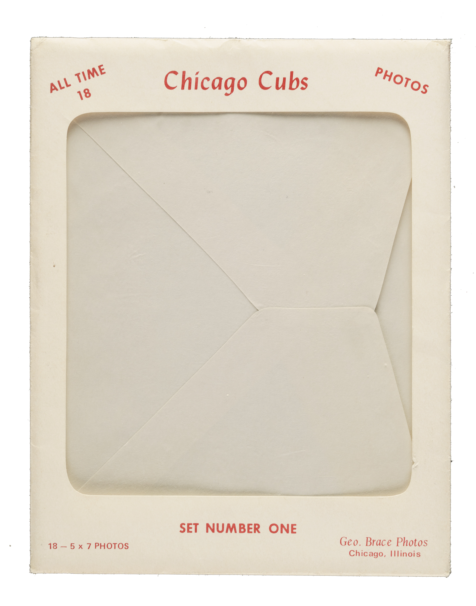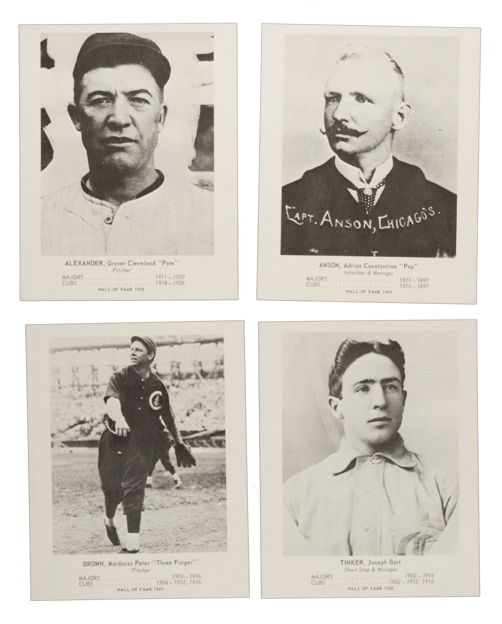 Complete 18-card set of 1963 George Brace All-Time Chicago Cubs baseball cards which includes eleven different Hall of Famers highlighted by Grover Alexander, Frank Chance, and Mordecai Brown. Also includes an original envelope. Condition ranges from Ex to Nr/Mt. Envelope grades Vg. Keys: Alexander (Nr/Mt), Anson (Ex-Mt), Brown (Nr/Mt), Chance (Ex-Mt+), Evers (Ex-Mt), Hartnett (Nr/Mt), Herman (Nr/Mt), Tinker (Nr/Mt), and Wilson (Ex-Mt). Total: 18 cards.