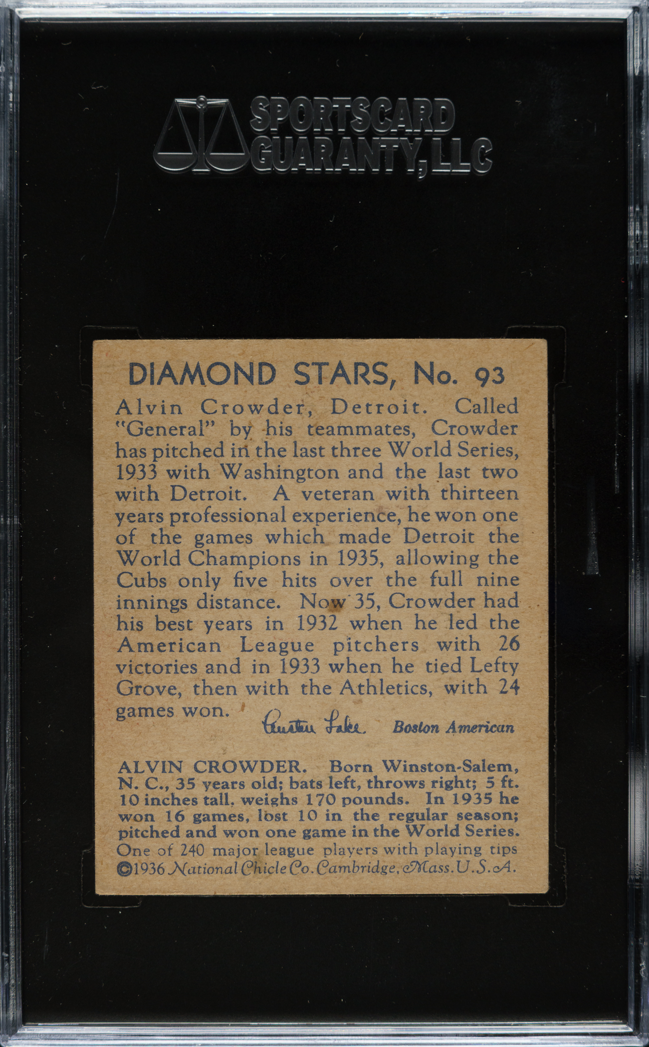Lot # 2183: 1934-1936 R327 Diamond Stars #93 Alvin Crowder SGC VG/EX 50