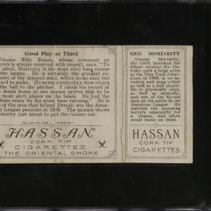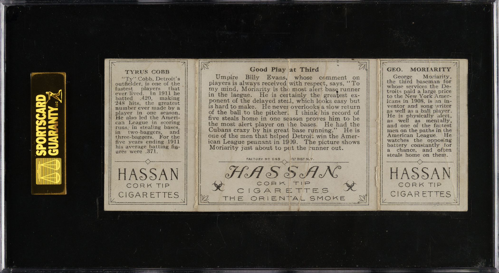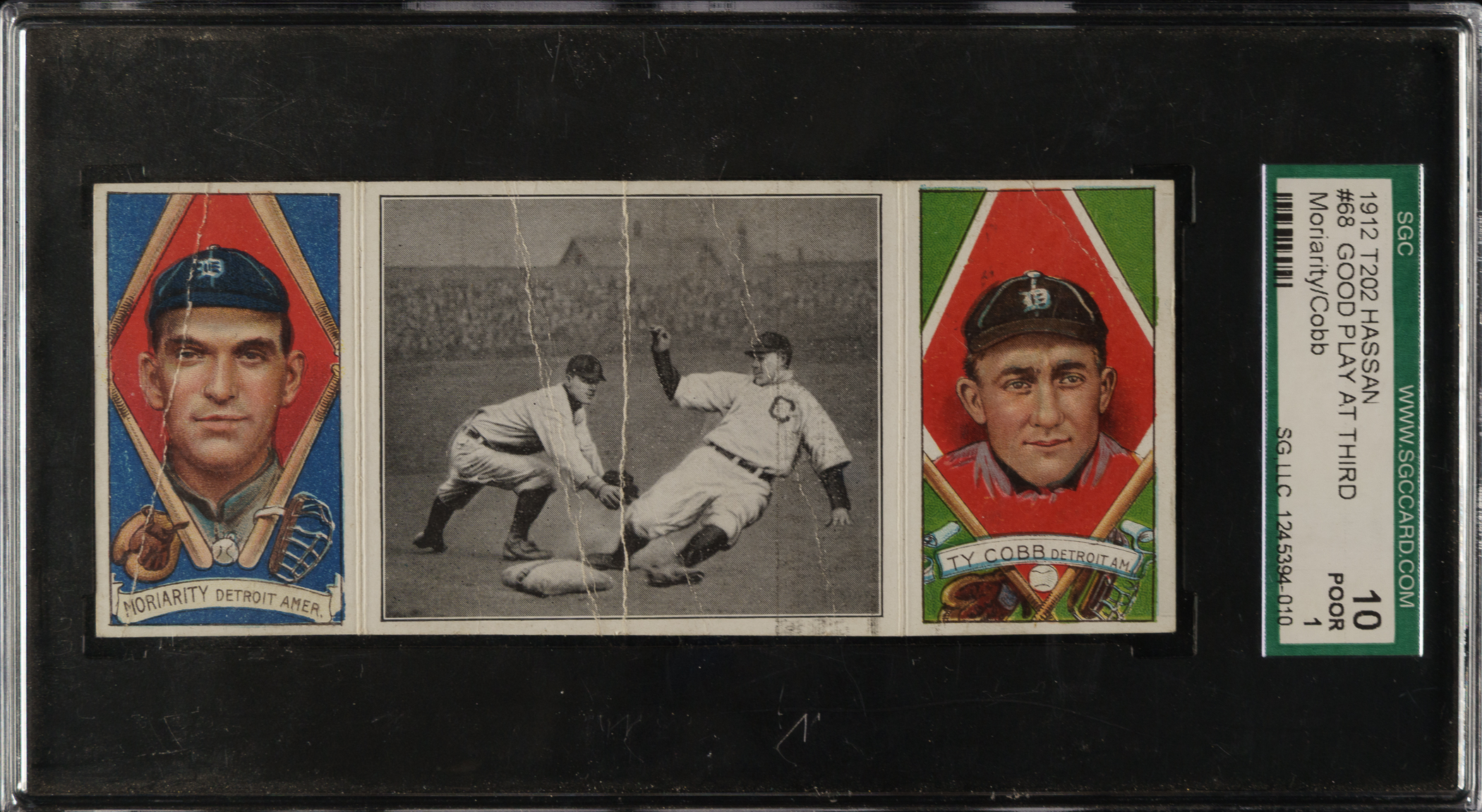 Lot # 1723: 1912 T202 Hassan Triple Folder "Good Play At Third" Ty Cobb/Moriarty SGC POOR 10