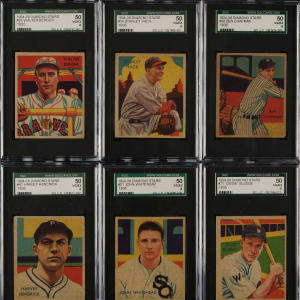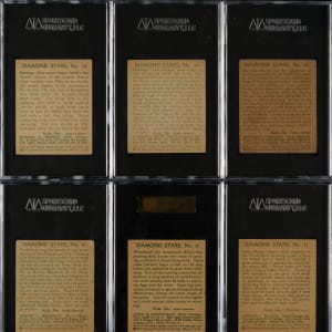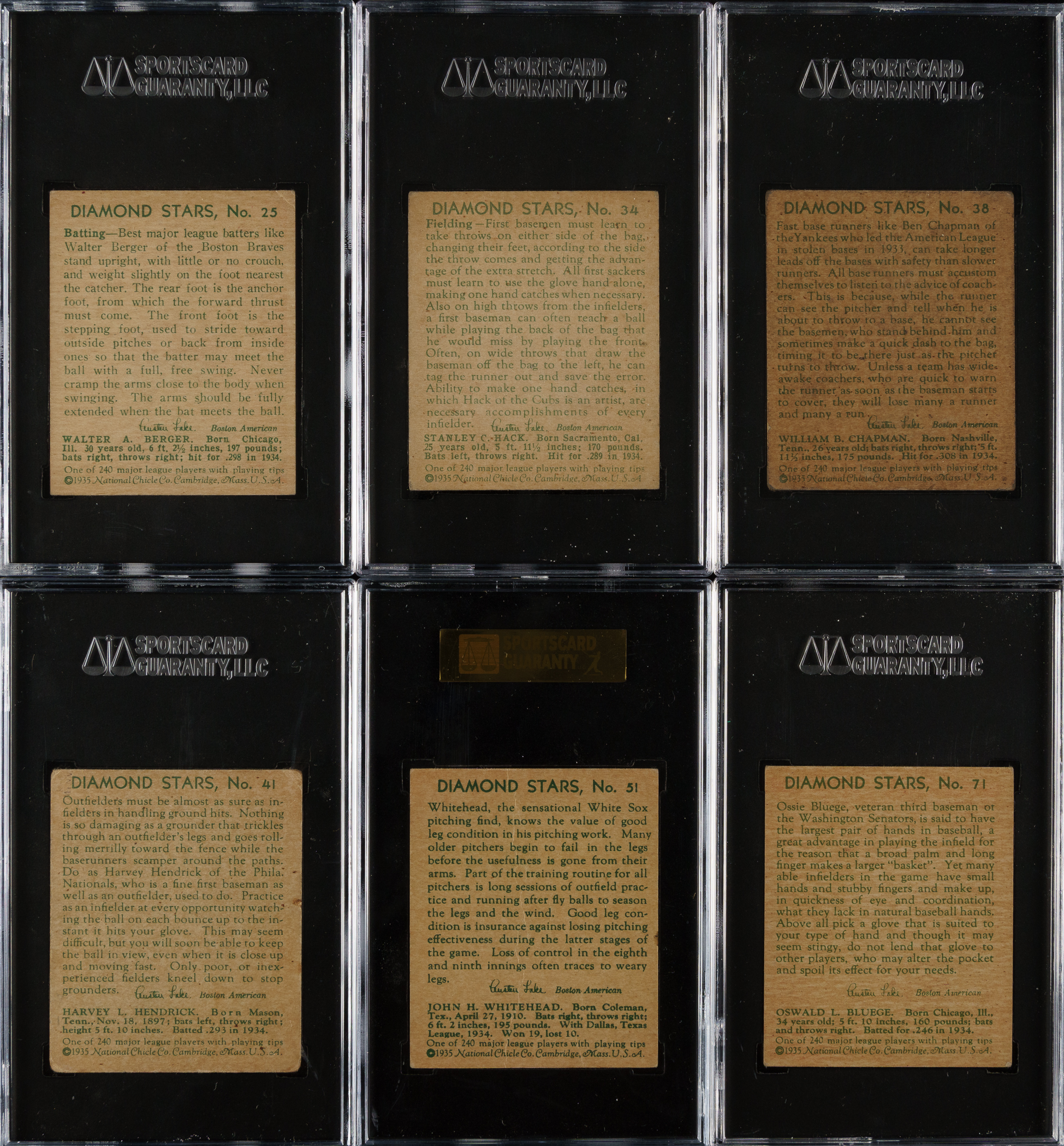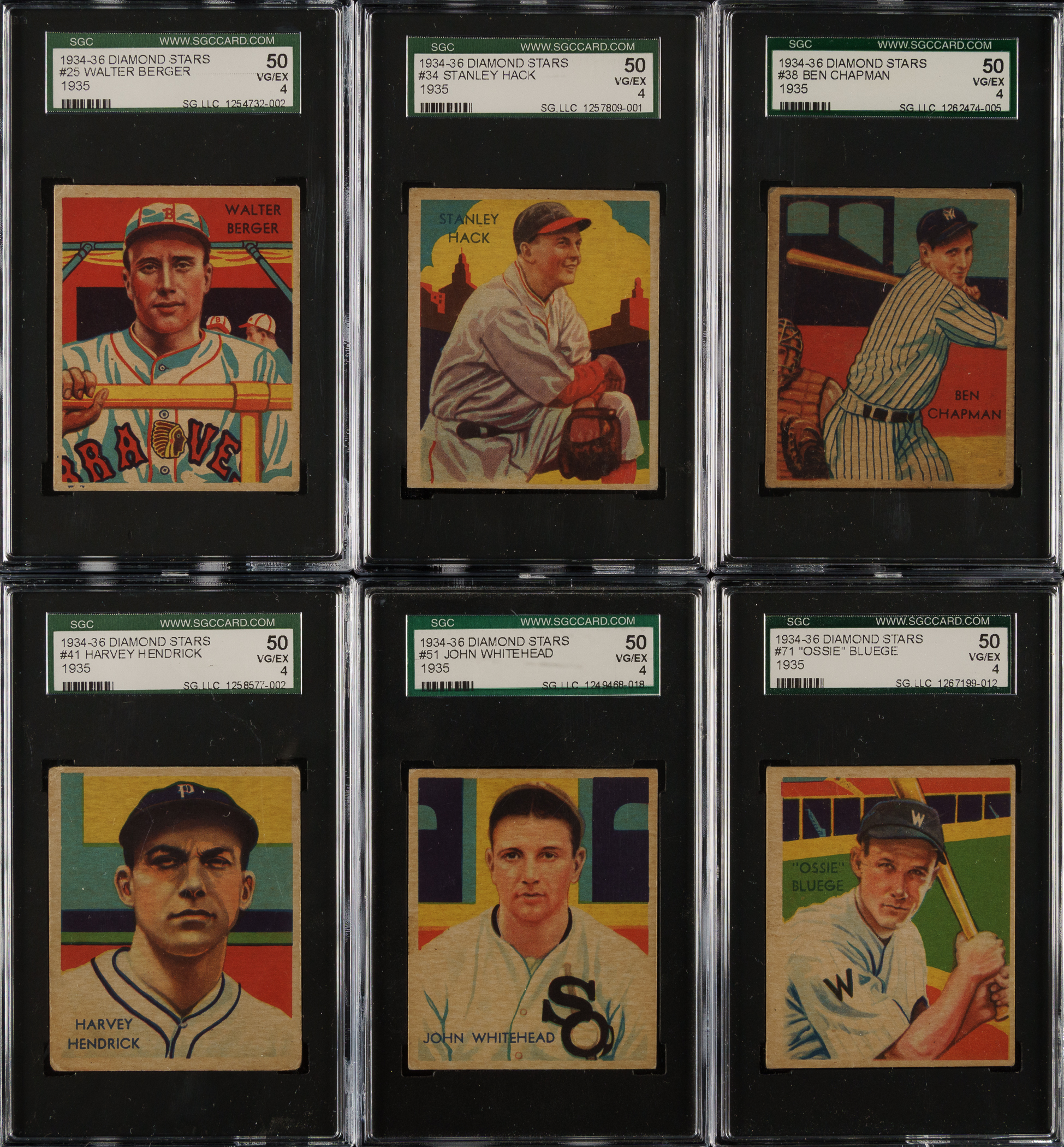 Collection of six 1934-1936 R327 Diamond Stars cards each card graded and encapsulated VG/EX 50 by SGC. This collection consists of the following: #25, 34, 38, 41, 51, and 71. Total: 6 cards.