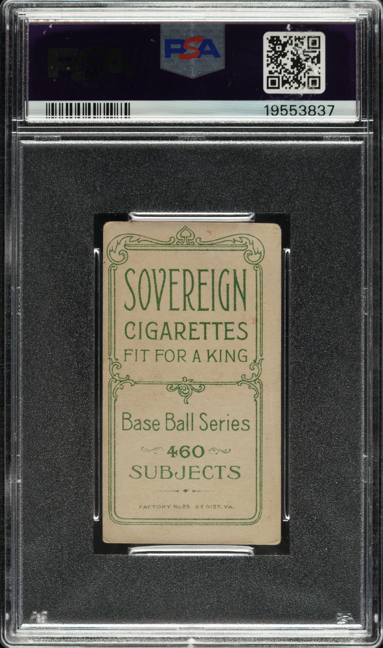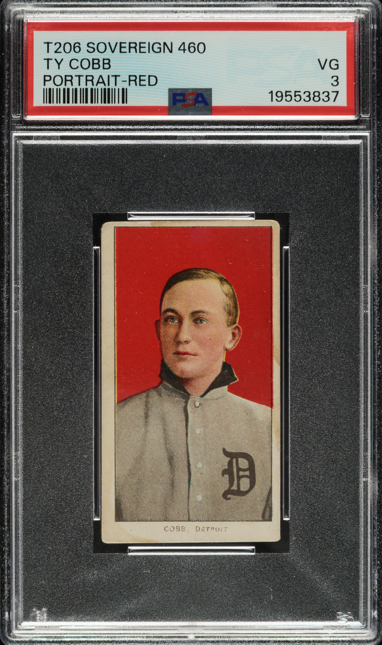 Graded VG 3 by PSA. Mid-grade example of this classic tobacco card featuring Hall of Famer Ty Cobb (red portrait pose) with an uncommon and desirable Sovereign 460 Cigarettes back. Though Sovereign 460 isn't normally considered an exceptionally rare advertising back, there are several subjects that are rarely found with a Sovereign 460 back, this being one of them. One of only seven graded examples by PSA with this front/back combination. This example has vibrant colors, a crisp image, moderate corner wear, and light staining along the white borders. The important Sovereign 460 advertising reverse is boldly printed.