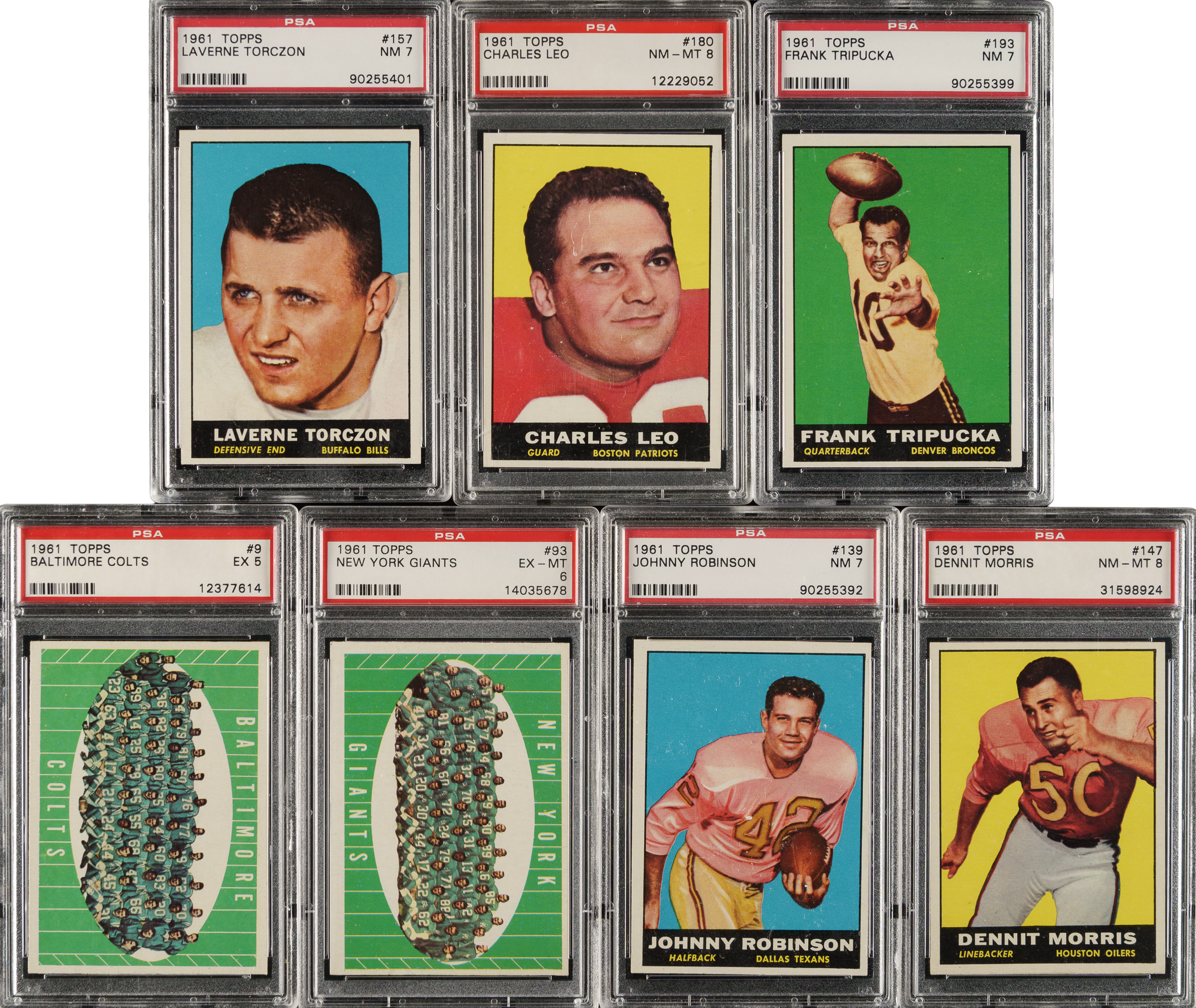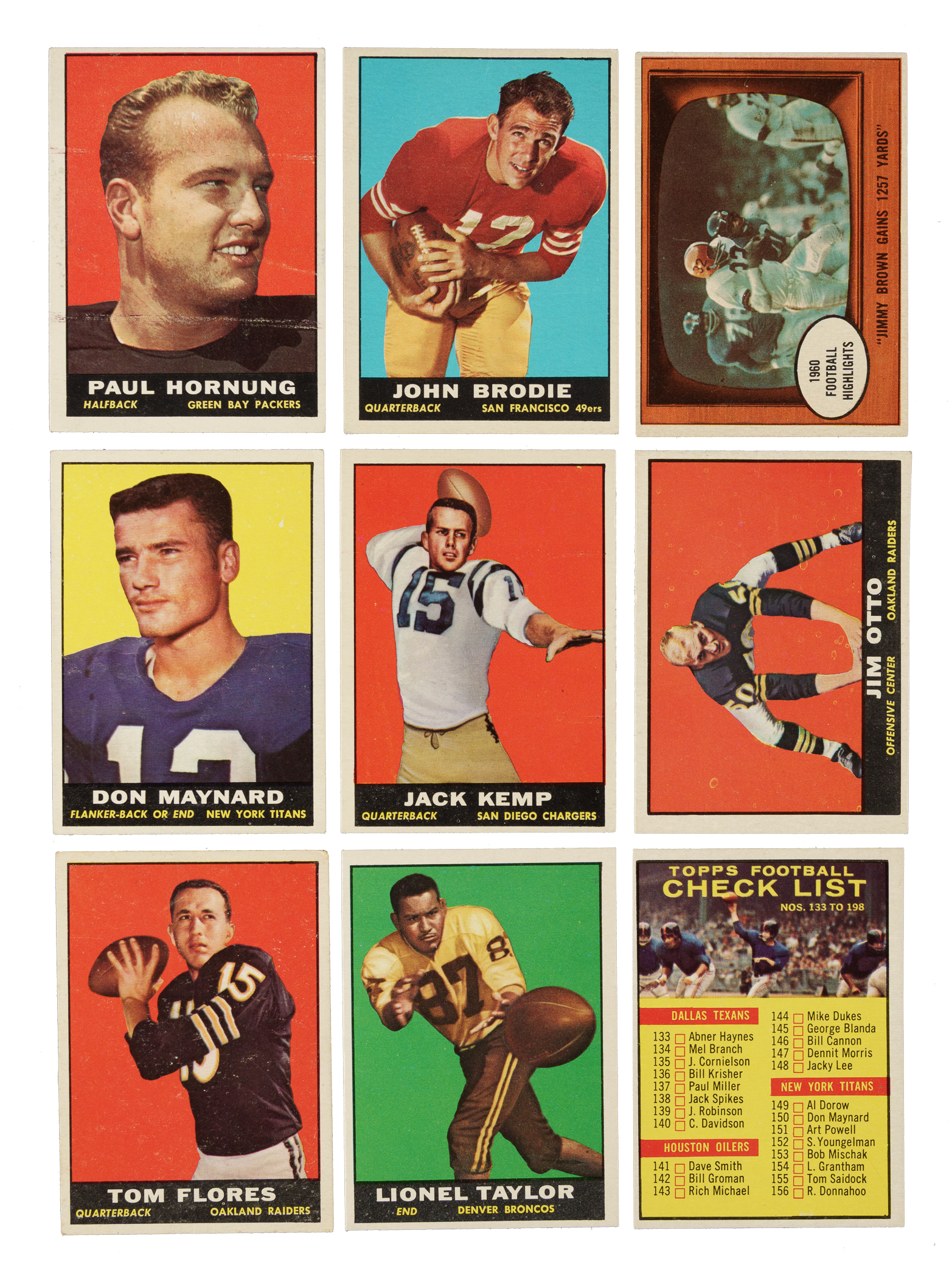 Complete 198-card set of 1961 Topps football. The 1961 Topps football set is one of the most popular of the decade for its simple design, crisp images, and brilliant colors. Condition is 32% Ex-Mt to Nr/Mt, 57% Vg-Ex to Ex, and 11% Gd to Vg (including one lesser and a few miscut). Seven cards have been professionally graded and encapsulated by PSA. Keys: #1 Unitas (Vg-Ex+), 39 Starr (Vg+), 40 Hornung (Vg), 59 Brodie RC (pencil mark on reverse, otherwise Vg+), 71 Brown (Vg-Ex+), 77 Brown IA (Vg-Ex+), 145 Blanda (Vg-Ex), 150 Maynard RC (Vg-Ex), 166 Kemp (Vg-Ex+), 182 Otto RC (slightly miscut bottom edge, otherwise Vg-Ex), 186 Flores RC (Vg), 190 L. Taylor RC (Nr/Mt), and 198 Checklist (Ex due to centering). Seven PSA-graded cards: NM-MT 8 (2 cards): #147 and 180. NM 7 (3 cards): #139 J. Robinson, 157, and 193. EX-MT 6 (1 card): #93 Giants Team. EX 5 (1 card): #9 Colts Team. Very attractive complete 1960s Topps football set, including many Hall of Famers and stars of the era. Total: 198 cards.