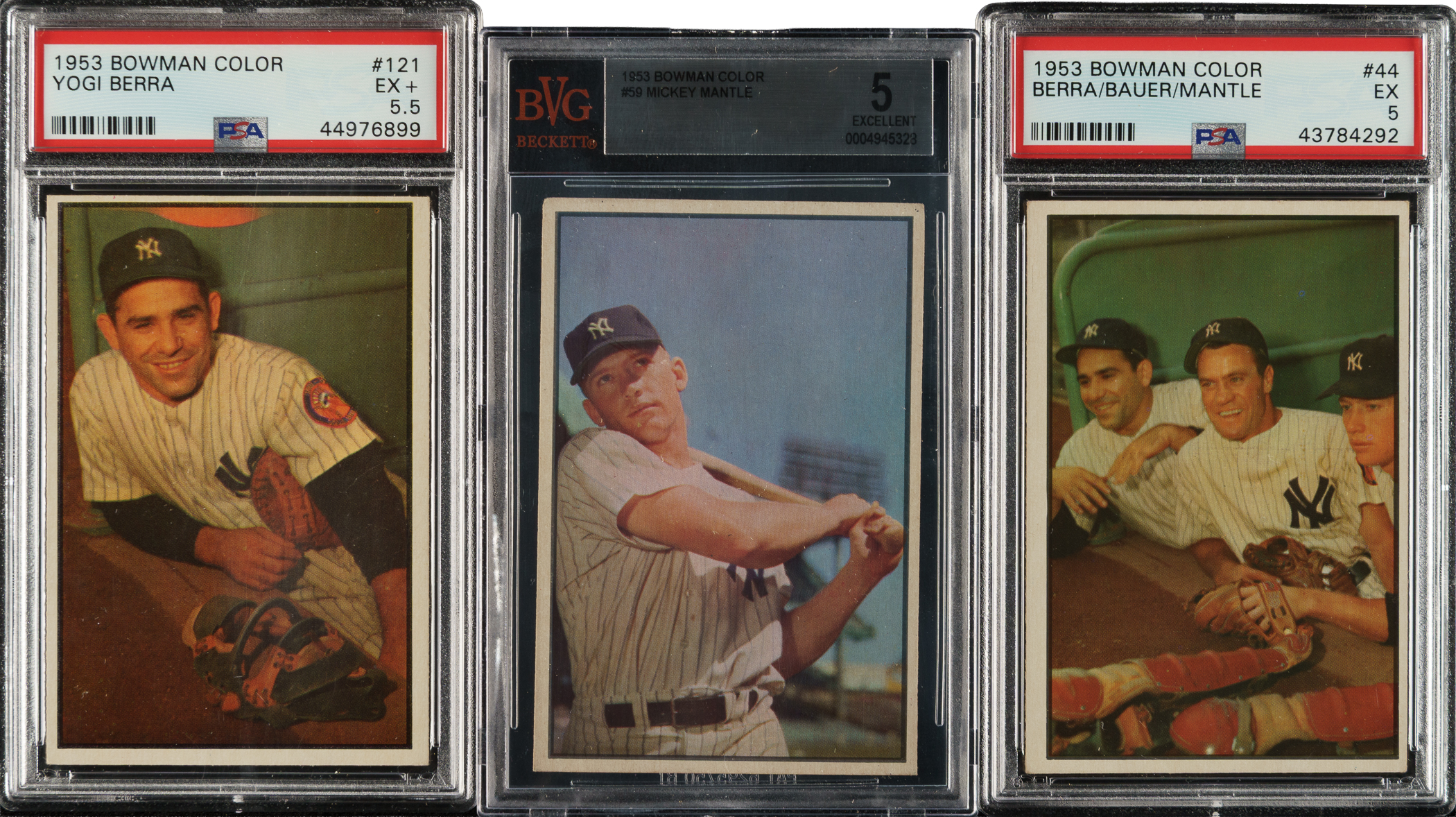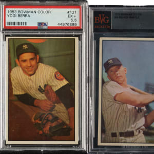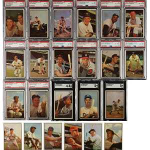 Very attractive mid- to high-grade near-complete set of 1953 Bowman Color consisting of 158 different cards, out of 160 in the set, missing only #32 Musial and 33 Reese for completion. Eighty-four cards have been professionally graded and encapsulated by PSA (79), SGC (4), and BVG (1). PSA Grading Composite: NM 7 (1 card): #12. EX-MT+ 6.5 (2 cards): #46 Campanella (SGC) and 97 Mathews. EX-MT 6 (49 cards): #2, 4, 6, 8, 9 Rizzuto, 10 Ashburn, 13, 15, 24, 26, 28, 36 Minoso, 41, 51 Irvin, 55 Durocher, 58, 64, 66, 72, 75, 79, 82, 92 Hodges, 93 Rizzuto/Martin, 94, 99 Spahn, 100, 101 Schoendienst, 102, 104, 105, 107, 114 Feller (SGC), 116, 117 Snider (SGC), 118 Martin, 130, 131, 133, 134, 136, 137, 141, 144, 149, 150, 151 (SGC EX/NM 80), 153 Ford, and 158. EX+ 5.5 (2 cards): #121 Berra and 129. EX 5 (24 cards): #1 Williams, 3, 43, 44 Bauer/Berra/Mantle, 47, 48, 59 Mantle (BVG), 63, 67, 69, 84, 85, 96, 106, 112, 115, 120, 122, 128, 138, 140, 146 Wynn, 147, and 148. VG-EX 4 (6 cards): #61 Kell, 68, 78, 81 Slaughter, 124, and 132. The condition of the 74-card unencapsulated balance is 17% Ex-Mt or slightly better, 68% Vg-Ex to Ex, and 15% Gd to Vg (including one that measures small and a few with a slight trim). Unencapsulated Keys: #18 Fox (Ex), 40 Doby (Ex), 62 Kluszewski (Ex), 65 Roberts (Vg-Ex), 80 Kiner (slight trim to right edge, otherwise Ex+), and 160 Abrams (slight trim, otherwise Vg-Ex). This is a very crisp and clean near-complete set (minus two) of this classic 1950s gum-card issue. The equivalent SMR value for just 78 of the graded cards (factoring in the three half grades at the lower whole-grade level and not including the six cards graded lower than EX 5) is $10,040. Total: 158 cards. The size/weight of this item requires that there will be an additional shipping charge for this lot.