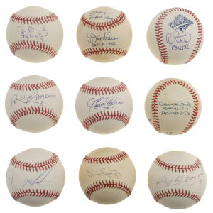 Collection of nine Hall of Fame and Stars single-signed baseballs. This collection consists of the following: Roberto Alomar, Tony Armas,Doc Gooden ("I Love NY" Inscription),Ron Guidry ("78 A.L. CY" Inscription, Beckett certification sticker), Don Larsen ("Only Perfect Game" and "Oct. 8 1956" Inscriptions, Beckett certification sticker), Gaylord Perry (Basic certification from James Spence/JSA), Darrell Porter ("Romano 10:9" and "Proverbs 3:5,6" Inscriptions, James Spence/JSA certification sticker), Willie Stargell (Beckett certification sticker), and Dave Stewart (1993 World Series ball, Basic certification from James Spence/JSA). Total: 9 baseballs. Auction LOA from James Spence/JSA. The size/weight of this item requires that there will be an additional shipping charge for this lot.