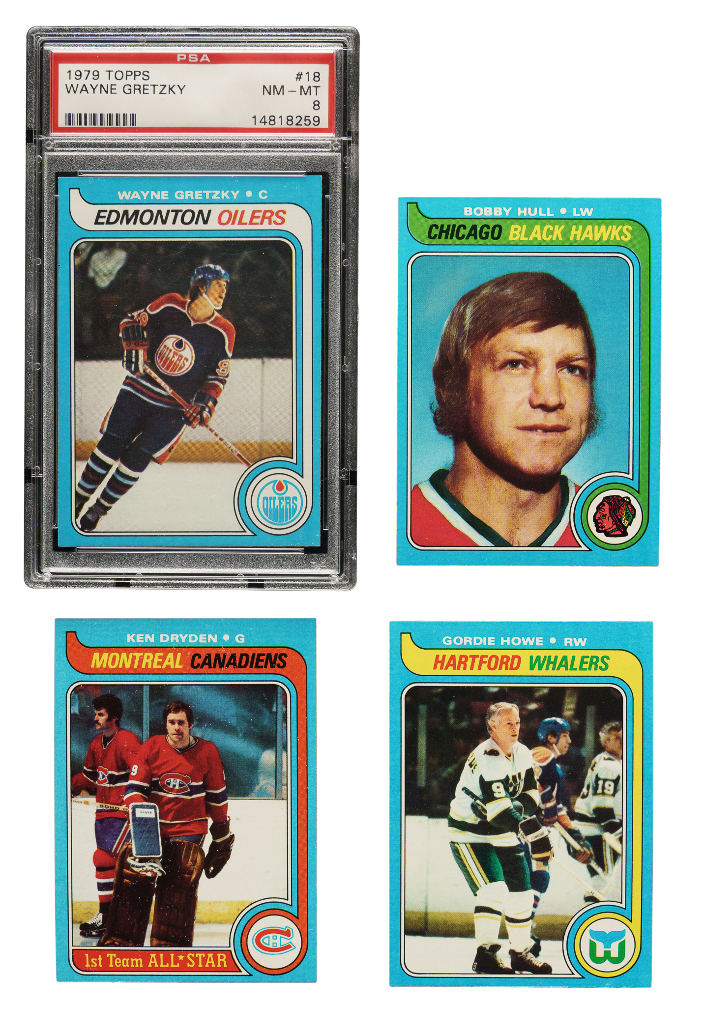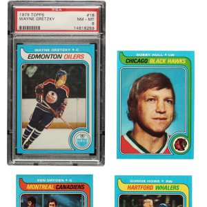 Presented is an extremely attractive and mostly high-grade complete set of 1979-1980 Topps hockey cards. This set includes the rookie card of Hall of Famer Wayne Gretzky (graded NM-MT 8 by PSA) and many other Hall of Famers including Dryden, Howe, Hull, and Bossy. The condition is 50% Nr/Mt to Nr/Mt-Mt (approximately two-thirds Nr/Mt) and 50% Ex to Ex-Mt (including 4% slightly lesser). Keys: #18 Gretzky RC (PSA NM-MT 8), 150 Dryden (65/35 T/B, otherwise Nr/Mt-Mt), 175 Howe (Nr/Mt-Mt), 185 Hull (30/70 T/B, otherwise Nr/Mt+), and 230 Bossy (Ex+). Included are four helmet and stick decals (Islanders, Red Wings, Oilers, and Rangers), grading two Nr/Mt, Ex-Mt, and Ex. This is an exceptional complete set of this popular hockey-card issue, with an outstanding example of the key Gretzky rookie card. Total: 268 cards (set of 264 plus four decal cards).